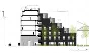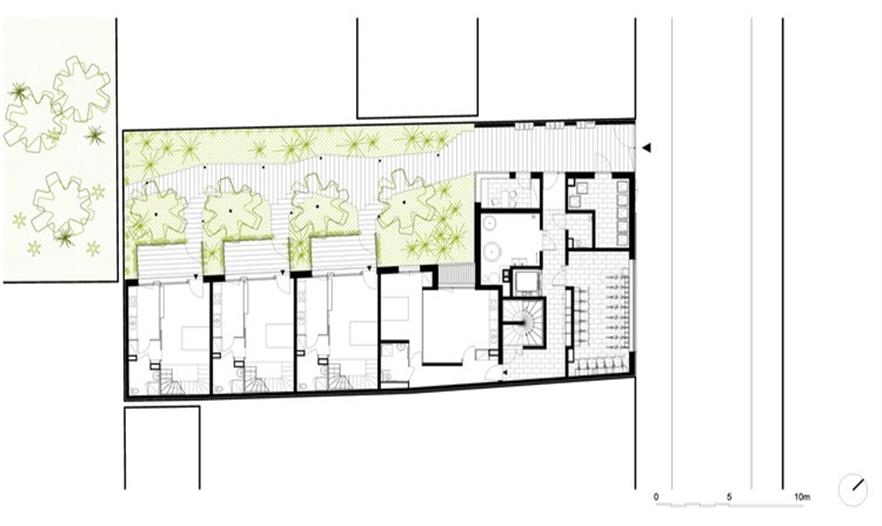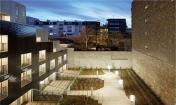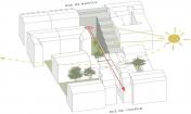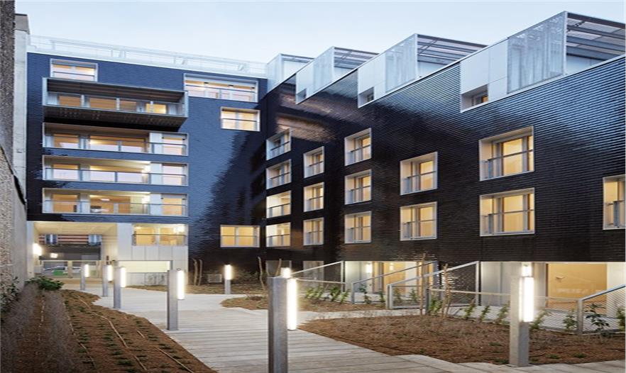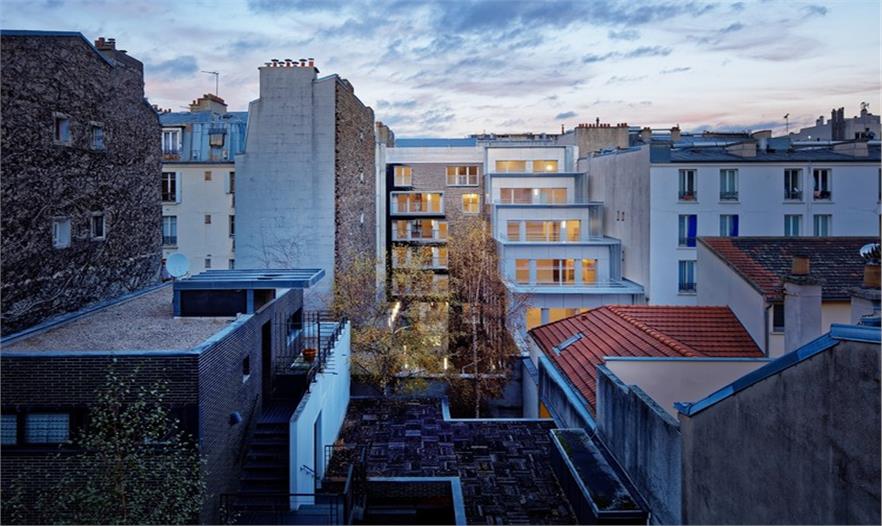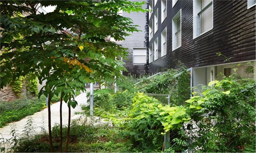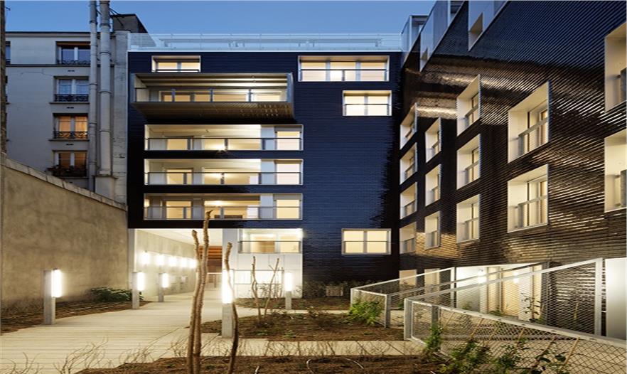 建筑臨街的立面自然地融入了四周環(huán)境,成為巴黎街景的一個(gè)片段,建筑每層都擁有一片大面積的私人露臺(tái),沒有任何遮擋阻礙。建筑體量與L形的建筑形態(tài)為種植著高大喬木的公共花園創(chuàng)造了絕佳的位置,三個(gè)聯(lián)排別墅組成了L的長(zhǎng)邊,同時(shí)限制了花園的邊界。建筑外墻拼貼了黑色琺瑯陶瓷磚,會(huì)隨著光線的亮度和方向反射出不同的效果。這棟優(yōu)雅的建筑與對(duì)面場(chǎng)地上建筑遙相呼應(yīng),該建筑位于rue de l’Ourcq大街上,是由Philippe Gazeau于1993年為Toit et Joie建造的。