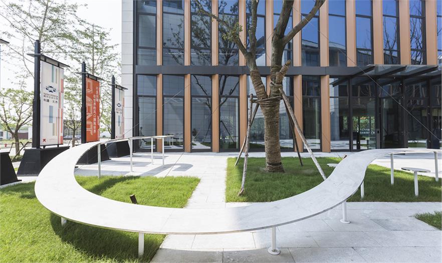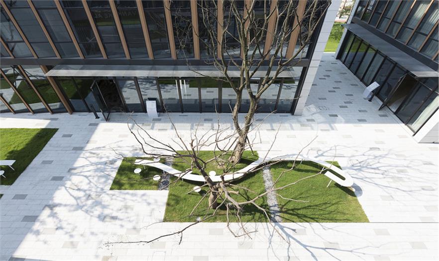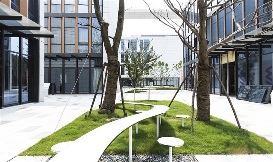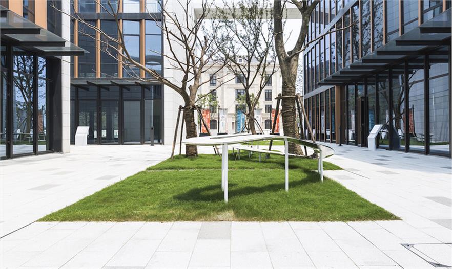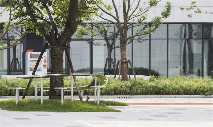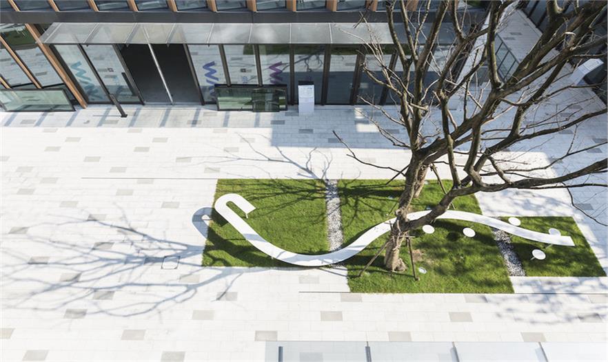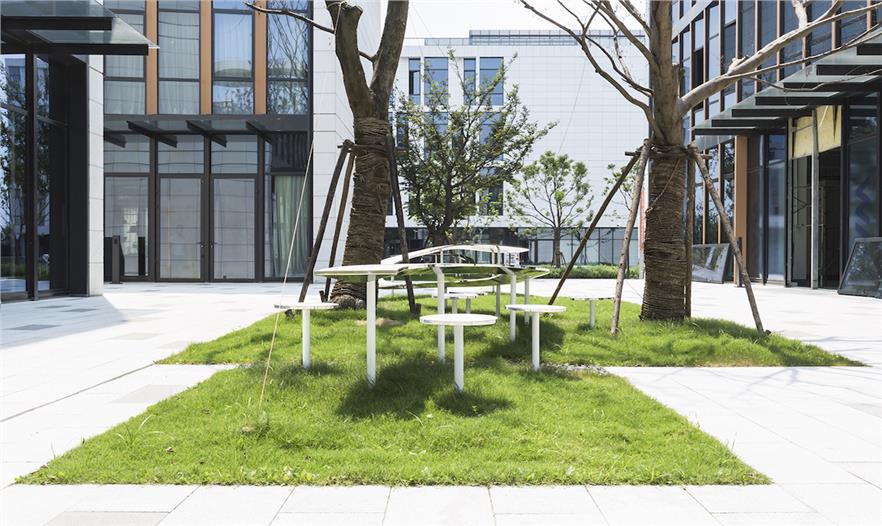 在上海這處辦公園區(qū)內(nèi),屬于公共空間的廣場四周矗立四棟固定的建筑,而在廣場上,搭建一件“室外家具”,便使人們走出建筑來到廣場時,在建筑里被固化的行為在廣場上獲得釋放和變通。整個空間像是四棟辦公樓之間的一個“室外的大堂”,廣場場地對應(yīng)“室外”,大堂對應(yīng)“室內(nèi)”,二者在此交融。