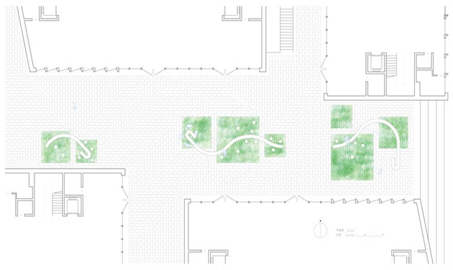 通過“長桌”處理植物與場地、與建筑之間的聯(lián)系,同時它又是為人服務(wù)的,滿足一般桌子的所有功能。個體的人在這里找到自己的一個位置,而多個“個體行為+獨立位置”連結(jié)起來,成為整體。建筑和自然被對等地對待。