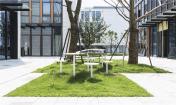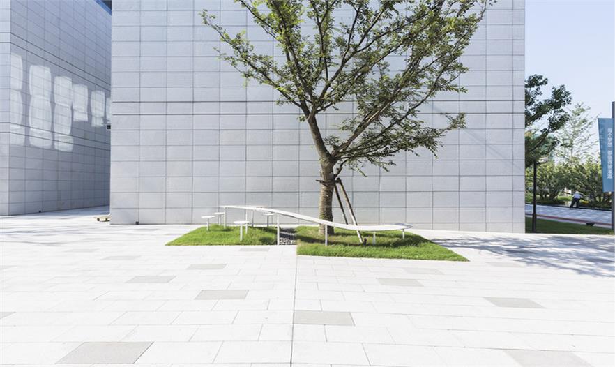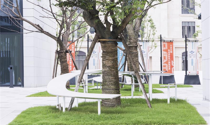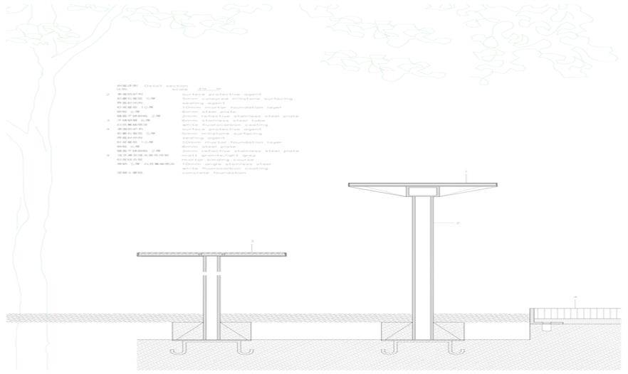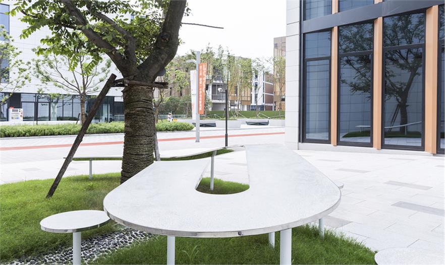 材料的使用上,采納常見的水磨石,傳統(tǒng)的材料和工藝讓人產(chǎn)生熟悉感覺。將水磨石與不銹鋼結(jié)合,既保證了實用性,又使人們在接觸到熟悉的材料時感到溫暖。長桌搭建完成,樹木加入其中,成為空間的一部分,既提供遮陽功能,又可作為人的聚集點。