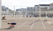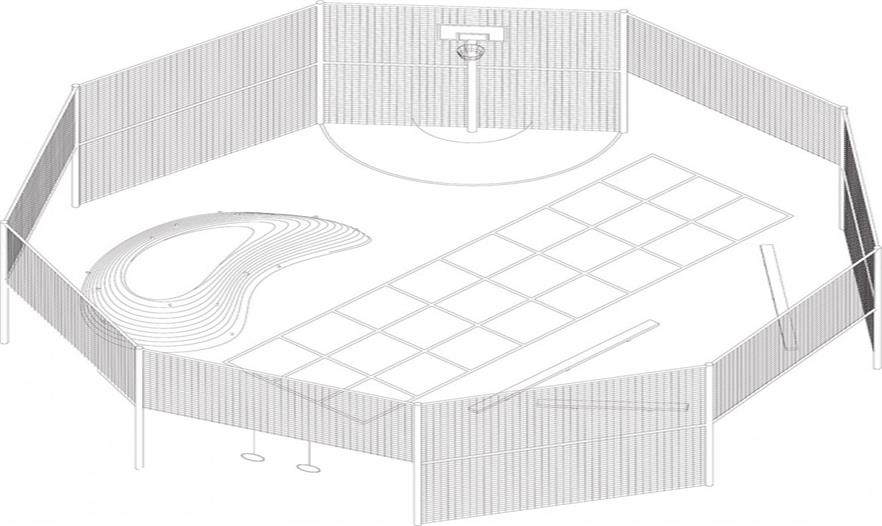 白色的防護(hù)網(wǎng)被置于球場兩兩相接之處,在保證運動場地互不干擾的同時維持了空間的開放與通透。而散布在開闊空地上的座椅也為人們提供了休息或觀看的停留場所。