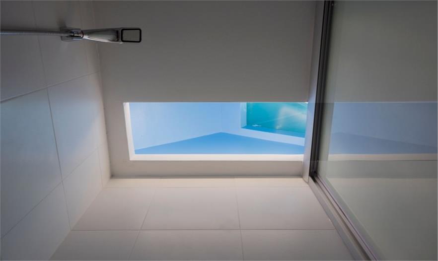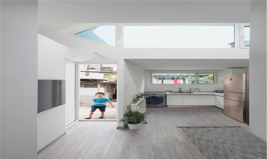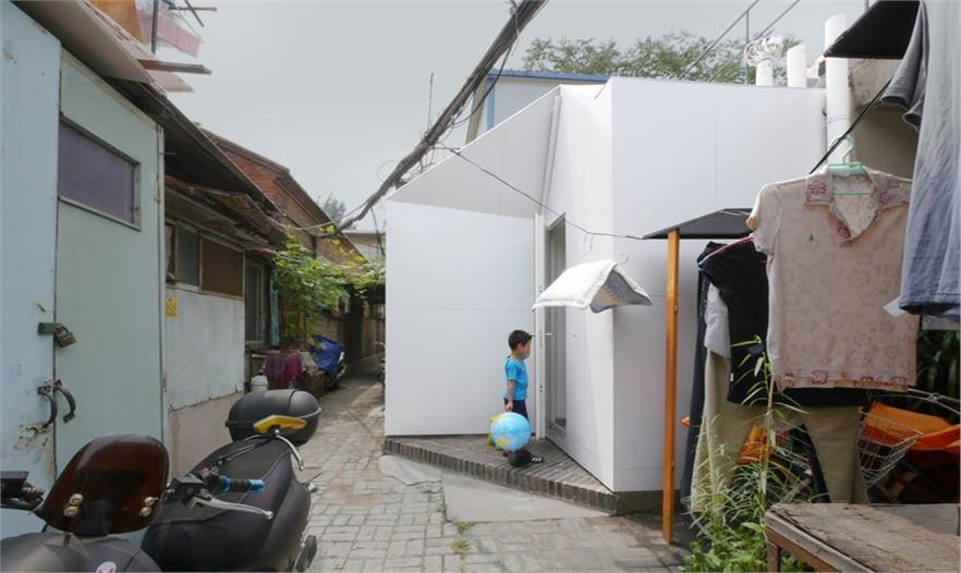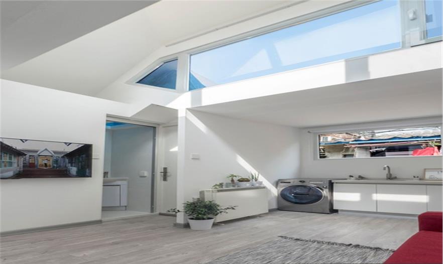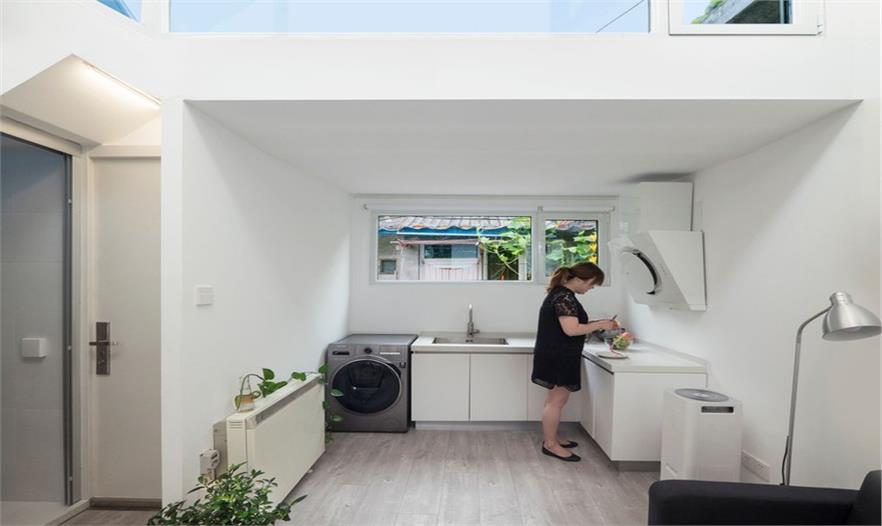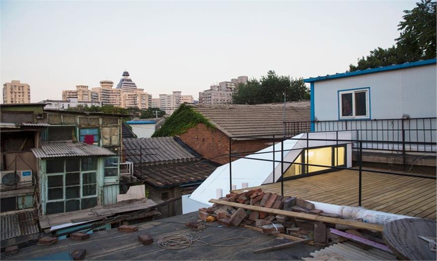 這間“插件家”是為患有幽閉恐懼癥的小樊量身定做的:客廳比原來的平房高近一倍,頂部雙側(cè)都開了高窗,陽光能夠鋪灑在室內(nèi)的每個角落。衛(wèi)生間屋頂隱藏的藍(lán)色頂面,讓這個小空間在霧霾天里也能反射出湛藍(lán)的天光。屋頂平臺讓小樊在擁擠的胡同環(huán)境中擁有一片能夠呼吸的小天地。