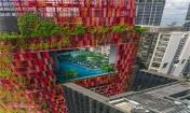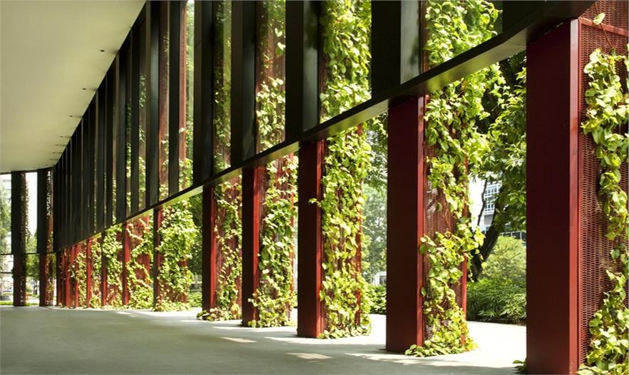 園林綠化廣泛用作建筑外立面處理,并在建筑內(nèi)部和外部形成主要的材料面板部分。 該綠色塔樓被認(rèn)為是鳥(niǎo)類(lèi)和動(dòng)物的避風(fēng)港,將生物多樣性重新引入城市,達(dá)到1,100%的總體綠地比例。 該綠化比重是一個(gè)令人興奮的數(shù)字,因?yàn)樗行У貜浹a(bǔ)了周遭10個(gè)建筑物缺乏綠色植被的情況。塔樓紅色鋁網(wǎng)包裹層被設(shè)計(jì)為一個(gè)擁有21種不同的爬藤的背景墻,五顏六色的花朵穿插在綠葉之間,為鳥(niǎo)和昆蟲(chóng)提供食物。 爬藤以馬賽克形式排列,每種類(lèi)型均可獲得其最適合的光照,陰影和通風(fēng)。塔樓的屋頂不是平屋頂,而是一座熱帶涼亭,充滿(mǎn)花卉,多樣,舒適和生機(jī)。