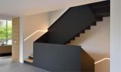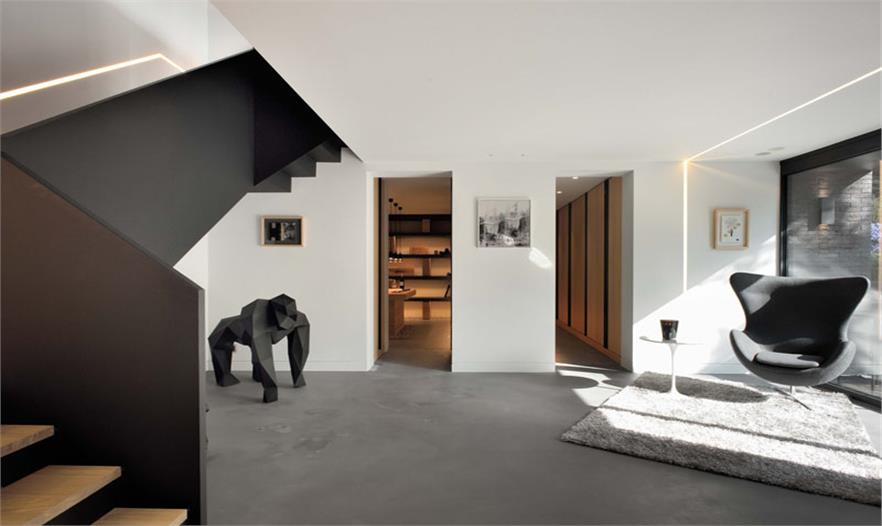 但是設計師要“挖掘”一樓,延伸其居住空間。一樓上還有該住宅的主入口。入口的對面是一個家庭辦公室,能觀賞到公園的景色。一樓通過大型黑色木制樓梯與主要的起居區(qū)域結合起來。
