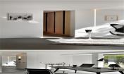 你可以順著樓梯進入到該房屋的樓上。該樓梯的特色是嵌入式的隱藏燈條,順著墻壁布置。從該建筑的樓上還能看到下面的起居空間。主臥室藏在走廊下面,設有大型落地窗戶。這是另外一個臥室,有一面墻壁,覆有嵌入式櫥柜以及開放的書架。在盥洗室內,大型鏡子安裝在兩個水槽上面,而木制地板為該空間增添暖色。