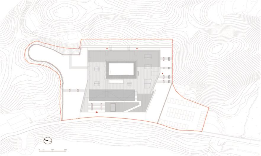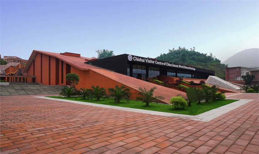丹霞赤水展示中心和游客中心位于貴州省黔北的赤水市復(fù)興鎮(zhèn)(丹霞地貌區(qū)內(nèi)),毗鄰赤水旅游大道,這是一片生長(zhǎng)著紅色丹霞石、有著復(fù)雜地形地貌特征的山地,由于該項(xiàng)目地處不同標(biāo)高臺(tái)地組合的地段,在對(duì)場(chǎng)地進(jìn)行適度的有序調(diào)整后,將建筑各功能單元體通過(guò)環(huán)形路徑串接,圍繞一方相對(duì)開(kāi)闊的庭院整合成一個(gè)向心型空間體系。