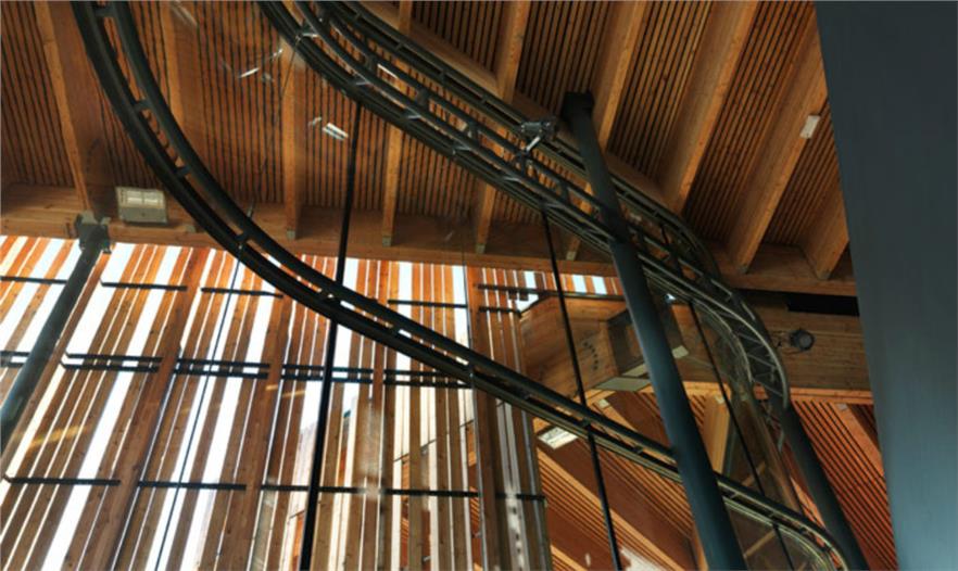 當(dāng)進(jìn)入建筑里面時(shí),游客看到的是一個(gè)弧形的落地玻璃墻。