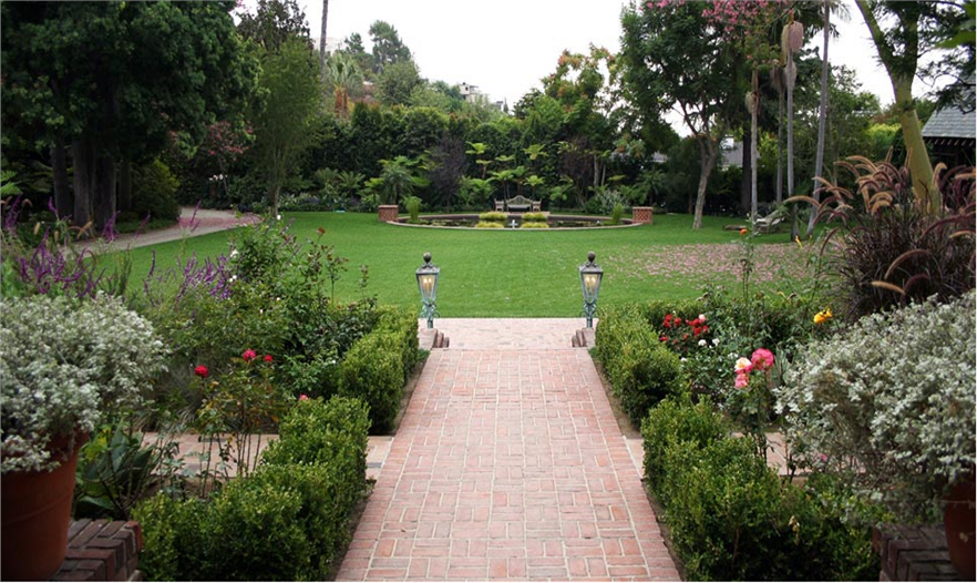 這個(gè)微微傾斜的地產(chǎn)坐落在西好萊塢山上,經(jīng)由一條曲折的車道進(jìn)入。該地產(chǎn)上有一座宏偉的英國都鐸式住宅,而且這個(gè)結(jié)構(gòu)的特點(diǎn)以及其周圍的地產(chǎn)建造出了獨(dú)特、浪漫的英國景觀。為了補(bǔ)充和突出主屋,現(xiàn)有的環(huán)形車道被改造成一個(gè)大草坪。這個(gè)大型草坪固定在南部邊緣,還設(shè)有一個(gè)倒影湖、2個(gè)磚燈籠,成為遠(yuǎn)處洛杉磯大型景色的前景。主屋的側(cè)面和草坪的北面是一個(gè)梯田狀開花花園,環(huán)繞著一條磚道,通往主入口。