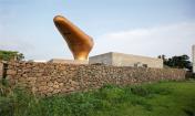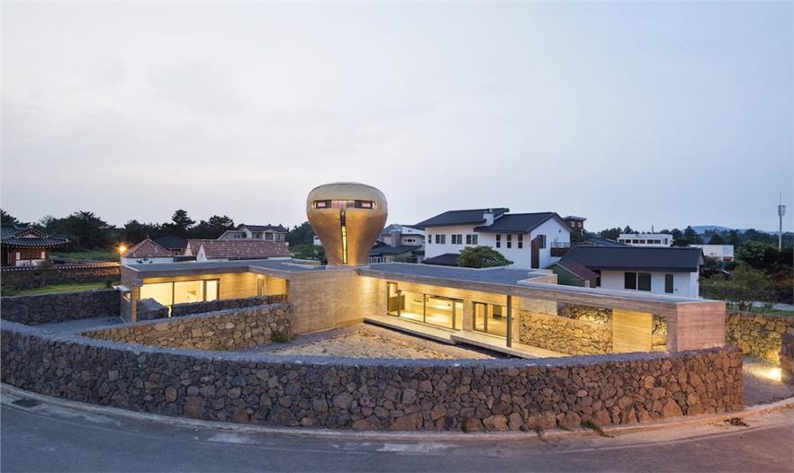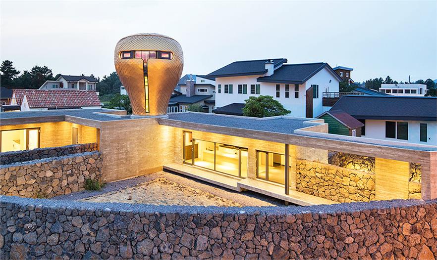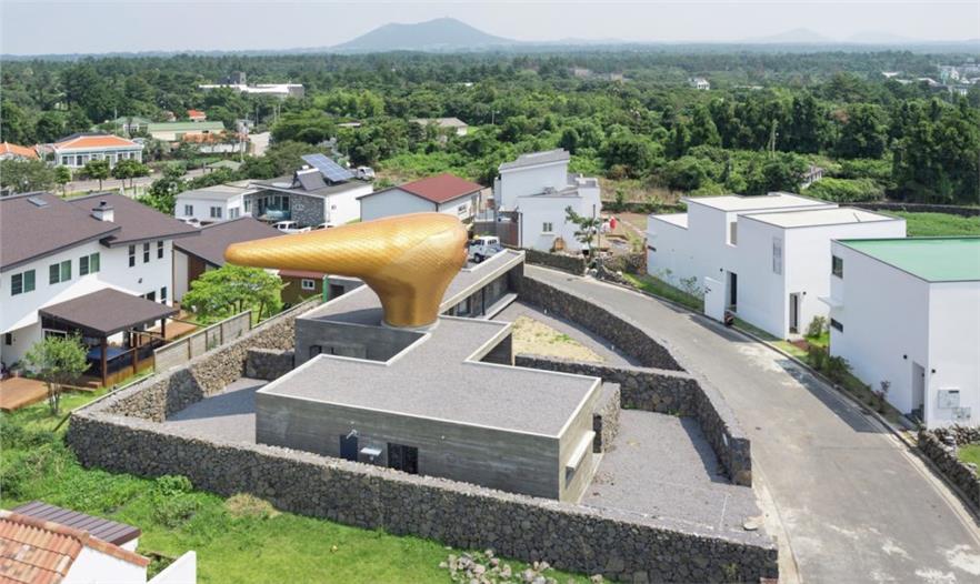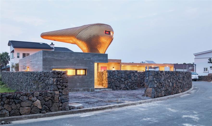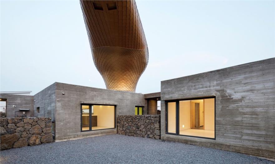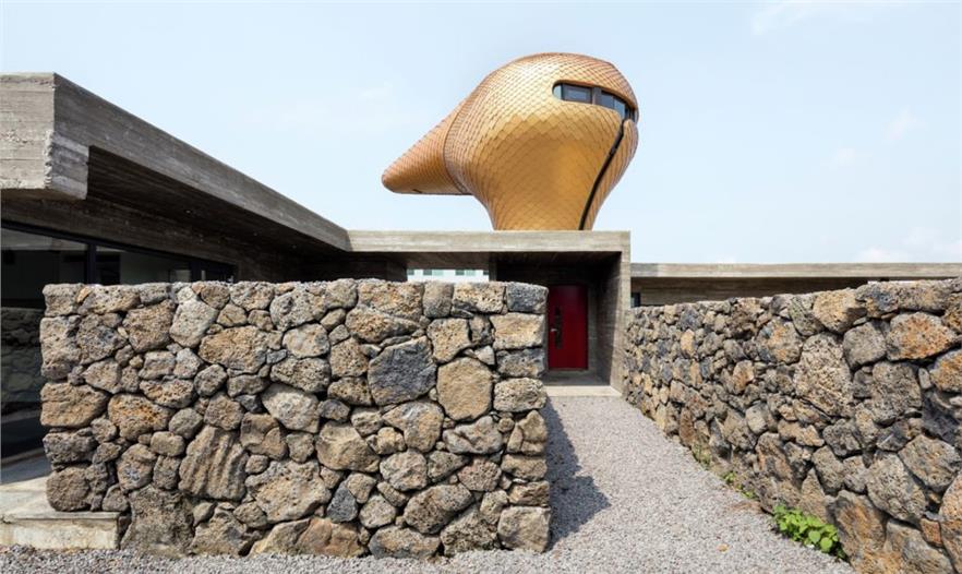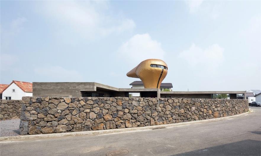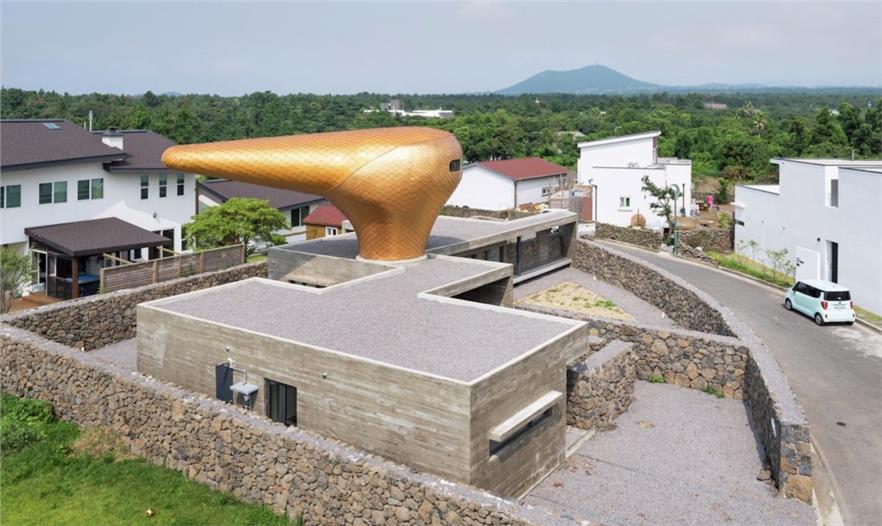 韓國濟(jì)州島出現(xiàn)了一個(gè)奇異的建筑,并不像我們之前看到的那樣。首爾建筑師Moon Hoon從不害怕跳出框框思考,他最近完成了Wind House建筑,這是一個(gè)凹陷結(jié)構(gòu),頂上有一個(gè)大型的金屬雕塑體,和鴨頭和吹風(fēng)機(jī)很像。除了其怪異的外表,其金色突出的形狀是從風(fēng)化景觀中獲取的靈感,當(dāng)然其金色暗指該島秋天和冬天的植物。