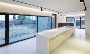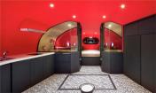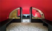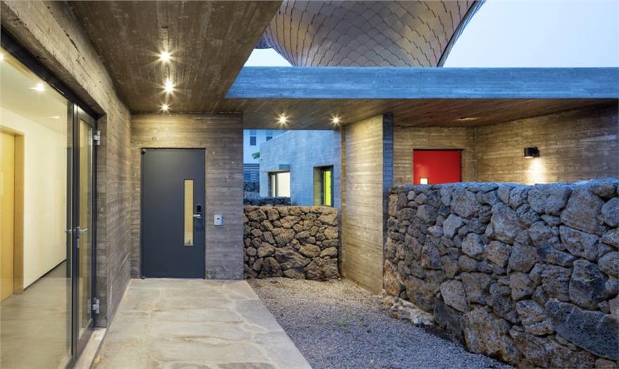 四四方方的灰色房屋是從傳統(tǒng)的濟(jì)州島建筑中獲取的靈感,與閃耀的金冠形成強(qiáng)烈的對(duì)比。這個(gè)鴨頭狀的空間經(jīng)由螺旋樓梯進(jìn)入,設(shè)有起居室、廚房和臥室。不像其他的室內(nèi)空間,這個(gè)懸浮花朵狀的室內(nèi)是紅色的,配置黑色家具和斑紋地板。人們能透過裂縫般的窗戶觀賞到漢拏山(該島中心的一座火山)。