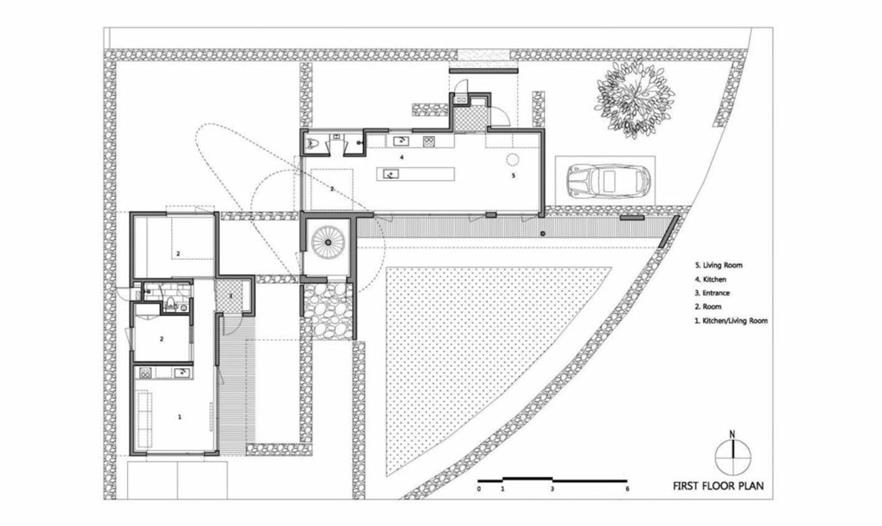 一位喜愛現(xiàn)代藝術(shù)和古怪風(fēng)格的眼科醫(yī)生委托Moon Hoon設(shè)計(jì)該建筑??蛻粢驢oon設(shè)計(jì)3個(gè)小房子,要求是它們是獨(dú)特且具功能性。最后的Wind House建筑包括一面火山石墻,環(huán)繞該區(qū)域的外圍設(shè)計(jì),2個(gè)凹陷房屋互成直角,中間的第三個(gè)房屋頂上有一個(gè)可居住的雕塑空間,Hoon描述成一朵開放的金花。