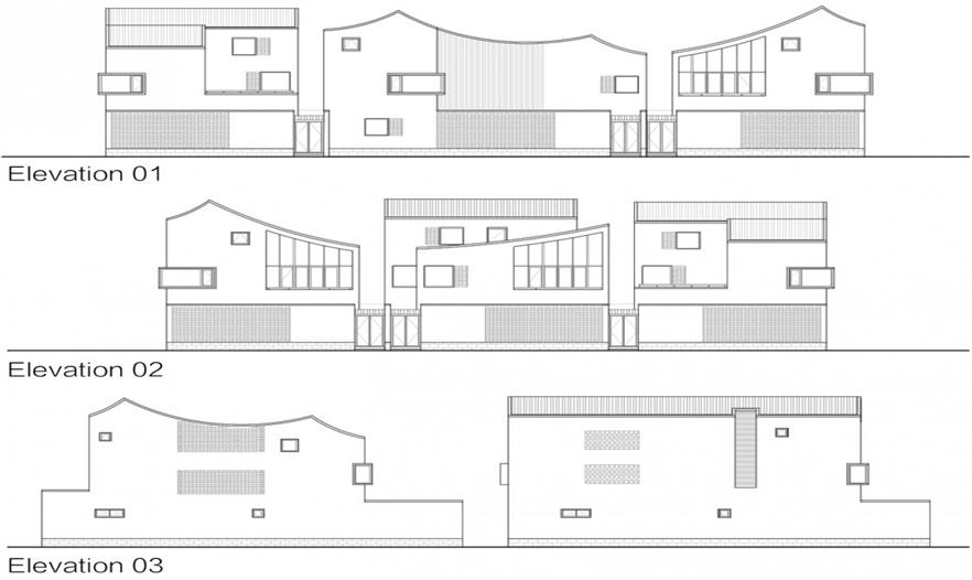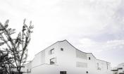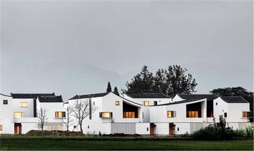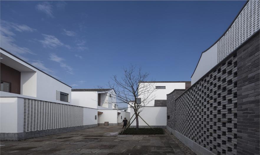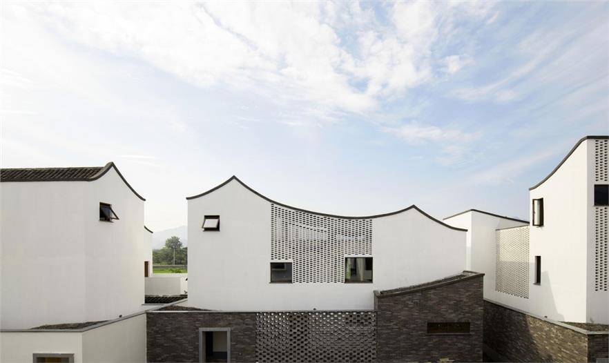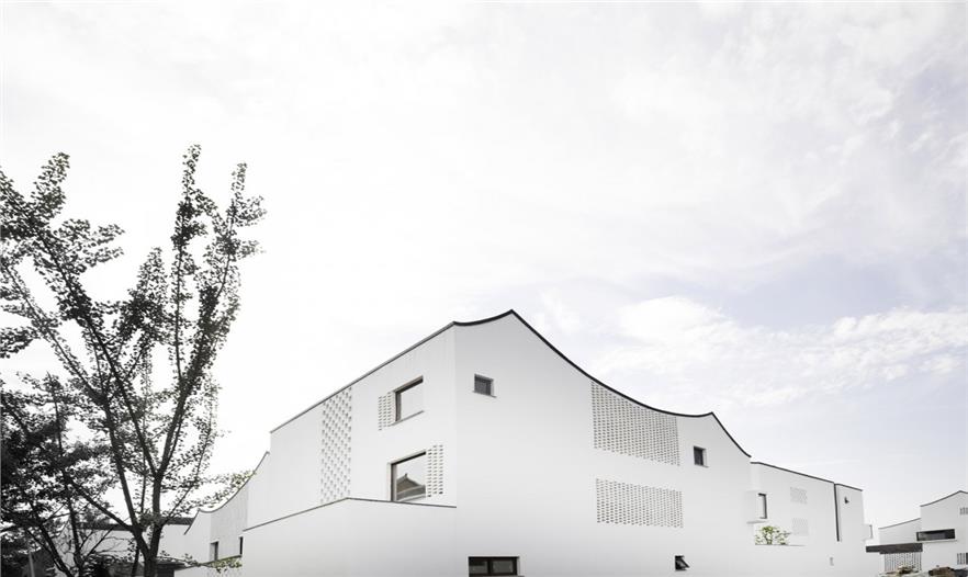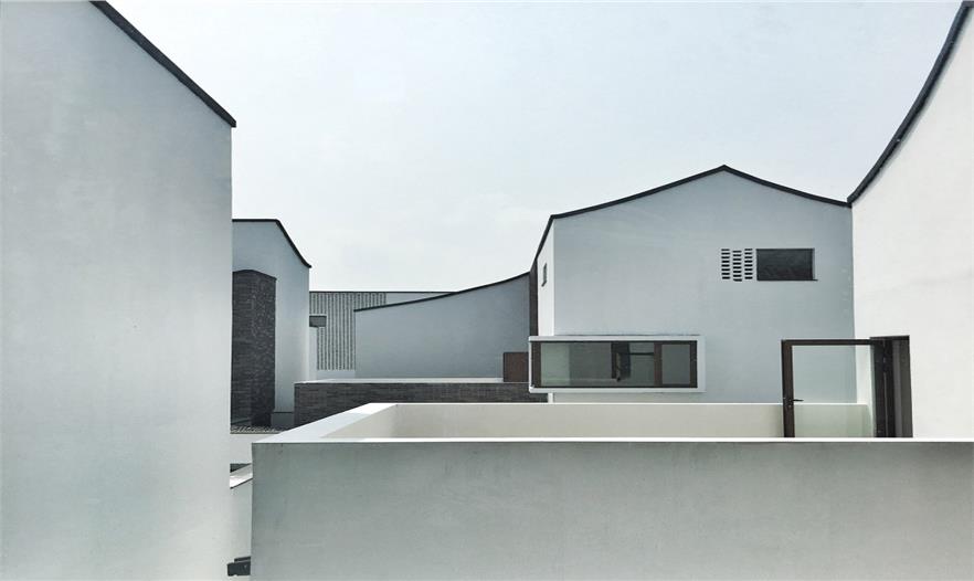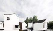 如何在控制造價、降低建造和后期圍護難度的同時,在新住宅中延續(xù)傳統(tǒng)的形式意向是項目的另一難題。設計中將江南民居中曲線屋頂這一要素作為切入點,提取、解析,并加以抽象,將傳統(tǒng)的對坡屋頂或單坡頂重構成連續(xù)的、不對稱坡屋頂,并且針對不同單元自身的形體關系塑造相匹配的屋面線條輪廓,單元體量的獨立性與群體屋面的連續(xù)感產(chǎn)生微妙的對比,形成一種若即若離的狀態(tài),構建出和而不同的整體關系,多樣性與統(tǒng)一性并存。深灰色的壓頂與白色大面實墻形成了強烈的白與灰、線與面的色調構圖關系。在虛實關系的營造方面,外墻以實面為主,朝向院落的界面以半虛及玻璃為主,既能保證采光需要,又能形成內向感。實墻上的方窗與延續(xù)進每家每戶的木質感格柵,在虛實之間完成了對外實內虛這一傳統(tǒng)建筑界面特質的現(xiàn)代轉換。