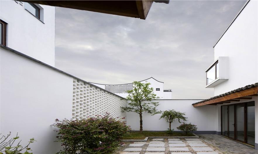 回歸到建造的本質,注重建造過程與完成形式之間的邏輯關系,探索工業(yè)化模式與傳統(tǒng)形式元素之間的關系。選擇了磚混結構形式、保溫剛性屋面樓板、保溫防水外墻以及雙層中空玻璃,用白涂料,灰面磚以及仿木紋金屬等商品化成熟材料代替木頭、夯土、石頭等傳統(tǒng)材料;在墻體的構造方面,以24厚的磚以不同的砌筑方式形成不同通透度的花格磚墻,對應于樓梯間、設備平臺、圍墻以及開啟扇窗戶等處,屋頂檐口設計上以內檐溝做法進行有組織排水,將落水管于“立面”中隱藏;頂部壓頂直接由混凝土澆筑出挑,近人尺度的一層挑檐等細節(jié)則采用傳統(tǒng)的木構工藝建造。以工業(yè)感襯托手工感,增加適度的豐富性和層次感,呈現(xiàn)出江南白墻黛瓦大基調下的肌理質感的變化通過對傳統(tǒng)住宅的形式要素加以提煉與轉譯,使得所選材料的加工方式得以體現(xiàn)在建造結果中。