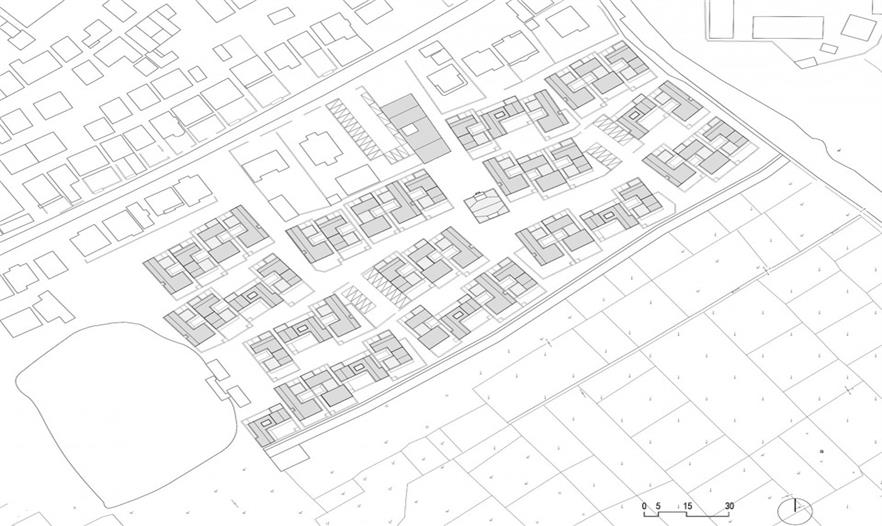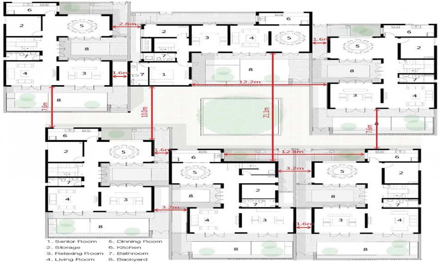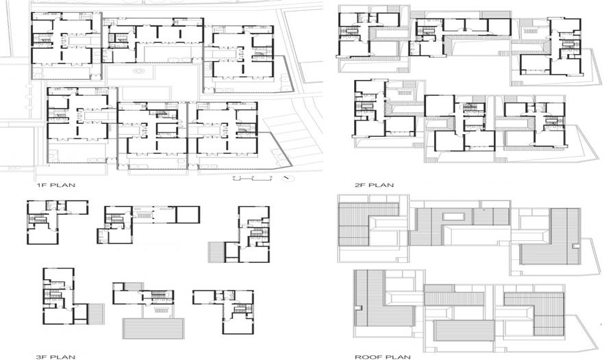 兩個基本單元建筑基底的適度變化演變出四種類型,將單元通過前后錯動、東西鏡像形成一個帶有公共院落的規(guī)模組團,與傳統(tǒng)行列式布局相比,在土地節(jié)約性、庭院空間的層次性和私密性上都有顯著提升。每個規(guī)模組團都有一個半公共開放空間,有助于鄰里間交往及團體凝聚力和歸屬感的形成。考慮到村民們對自宅“獨立性”的強烈訴求,戶與戶之間都完全獨立,不共用同一堵墻,間距在1.6-3.2米不等。若干個組團的有序生長衍生便逐步發(fā)展成有機多樣的聚落總圖關系,這種從單元生成組團,再由組團演變成村落的生長模式與傳統(tǒng)中國古建筑的群體生成關系邏輯一致,也為未來的推廣提供了較強的可操作性和可能性。