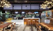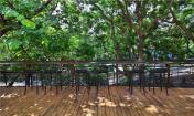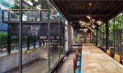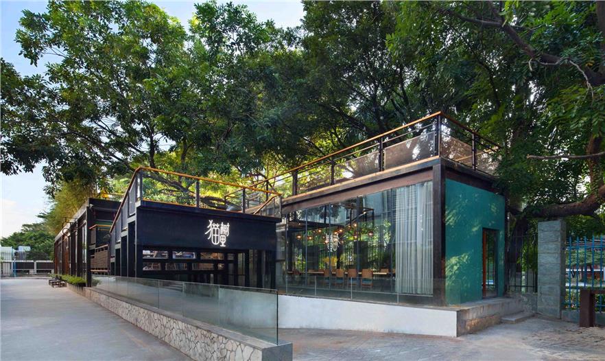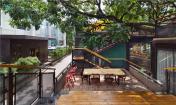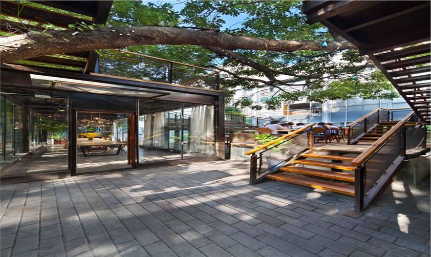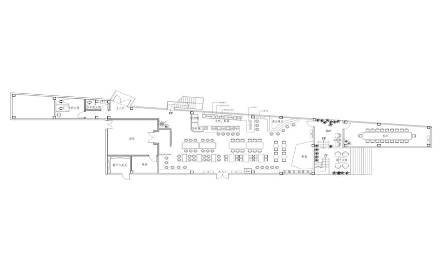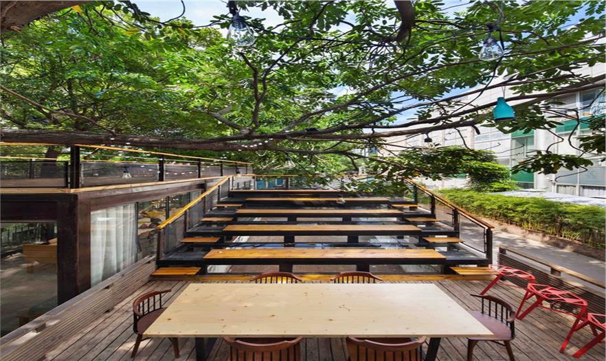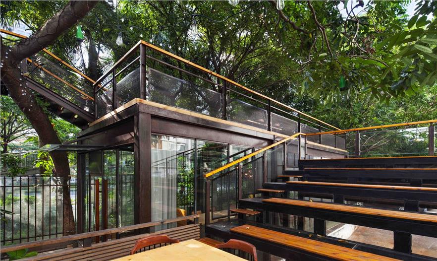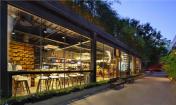 基地面積約500平方米,由于形狀細長, 咖啡廳在規(guī)劃功能上有一些限制, 我們把功能分為三個區(qū): 交流,用餐和配套區(qū)。交流區(qū)是一個獨立玻璃房帶院子和露天小劇院, 在這里可以容納不同人群的活動。 用餐區(qū)是一個開放區(qū), 以中間的吧臺為主體, 配合不同高度層次的書架??Х葟d建筑是一層的鋼結(jié)構(gòu)房子,加上鑄鐵框的落地玻璃,自流平的地面和水曲柳的家具配搭 , 一是由內(nèi)融入基地優(yōu)美的環(huán)境但同時有家的溫馨感覺, 二是從外減少建筑的重量感和存在感, 期待來這里的人感覺自己處在一個亭子或院子之中喝咖啡, 或發(fā)呆, 享受在校園中的一種獨處時光。