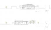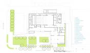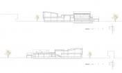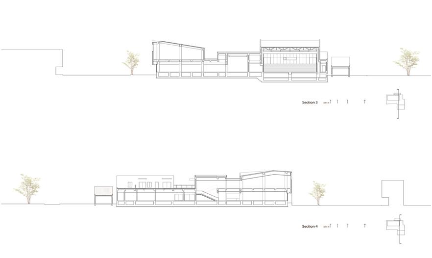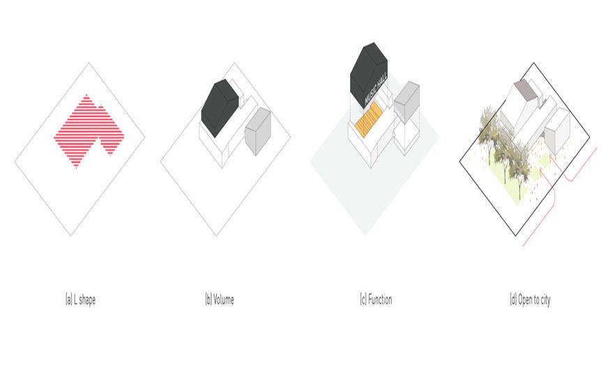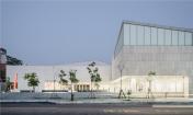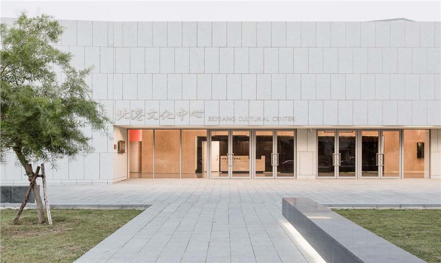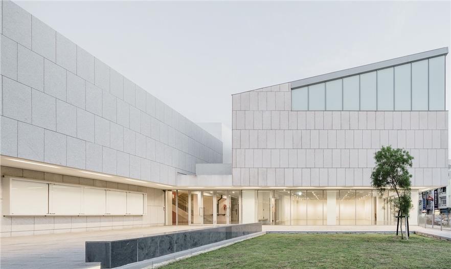 北港文化中心的機能單純,以360席音樂廳及常設,特展兩間展示室為主體,因此這棟建筑的量體及型態(tài)足以在城市中扮演主要交通節(jié)點及完成一個重要街的任務。我們以切成大小兩塊量體的L形平面來回應十字路口,有高差的廣場及長階梯創(chuàng)造臺灣城市少見的微量剖面及視角變化。分別含容音樂廳與展示室的兩個體體以不同的石材外掛,并以單斜屋頂?shù)慕嵌劝凳酒湎鄬耐獠繝顟B(tài),我們特意將屋頂從各式設備的束縛下解脫,以干凈的面貌對應充滿屋頂加蓋的環(huán)境。
