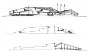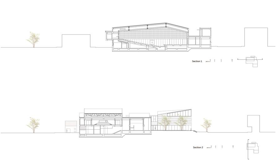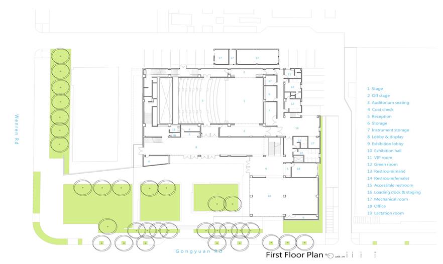 與具重量感的建筑量體形成對比的,是內(nèi)部空間的流動性和地面層帶狀落地窗的穿透性,我們用“空”將實體串連,使石材量體猶如漂浮于廣場之上。長條形的大廳沿著建筑長軸展開,透過端點的樓梯整合空間的轉(zhuǎn)折,將上下兩間展示室動態(tài)地結(jié)合起來,延續(xù)到次要入口。大廳另一端的直通樓梯體外的二樓前廳,模糊了內(nèi)外的關系,讓建筑內(nèi)部的活動外翻呈現(xiàn)于市民眼前,最后再將動線帶回音樂廳之中。音樂廳同樣采用拉長的鞋盒型,不采用反射板以維持整個室形的純粹,靠屋頂雙斜面以及兩側(cè)墻面上部的反向雨淋板裝修,將音樂反射至觀眾席并避免駐波產(chǎn)生??照{(diào)采用地板出風,除節(jié)能考量外,亦可讓主要設備置于地面而非屋頂,吻合自由屋頂?shù)母拍睢?br/>