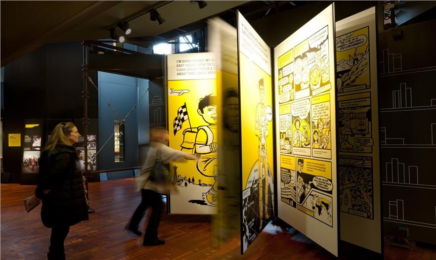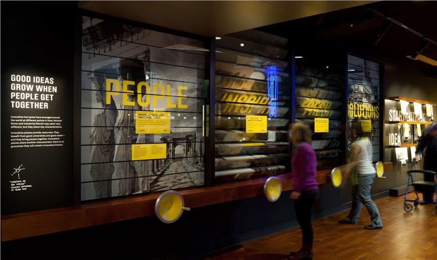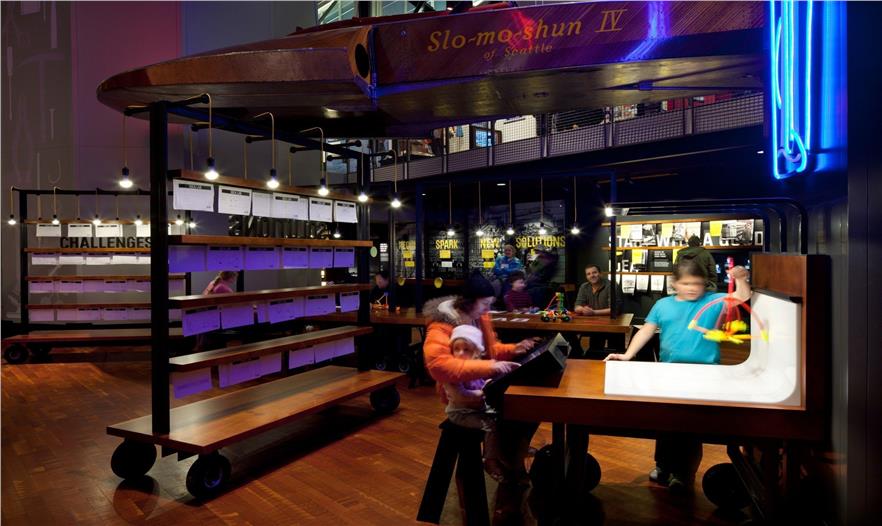 Idea Lab版塊讓參觀者共同辨識和解決當今最緊迫的一些問題。在We Shape our City展覽版塊中,參觀者能夠在自助快照亭獲取照片,將他們的照片和理念添加到討論中。Seattle Patent Tree版塊提供普吉特海灣區(qū)創(chuàng)新精神的三維歷史,讓參觀者放棄他們最喜歡的西雅圖建造原始概念。Go Big!版塊是2.7米*3.6米(9英尺*12英尺)的一部漫畫小說,闡述西雅圖機構(gòu)的歷史,講述了5個關(guān)于連接、治愈、工作、購物和移動的簡短故事,而Launch Pad版塊鼓勵參觀者參與到技術(shù)創(chuàng)新互動性探索當中,。