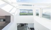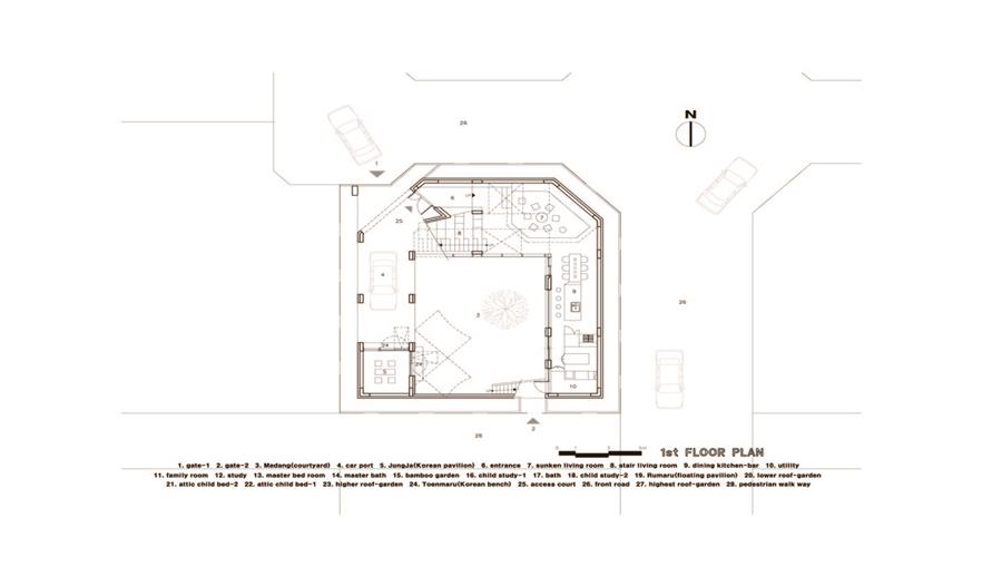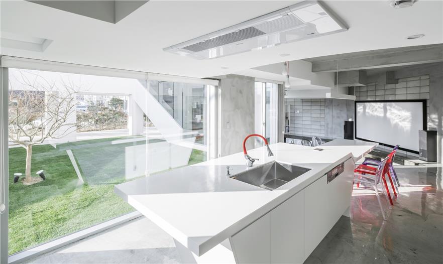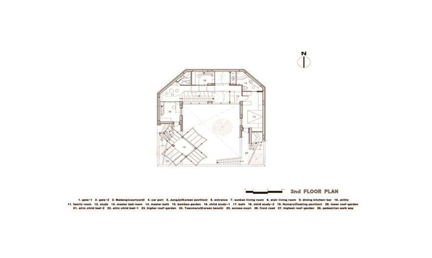 我們將韓國傳統(tǒng)建筑師的空間和景觀元素,如院子,花園和亭子改造成現(xiàn)代住房項目,利用房子的主要外部空間,綠化屋頂,這樣從院子漫步到屋檐,能欣賞傾斜屋頂上的花園美景。這使得住宅與自然共存,構(gòu)成一個景觀山。