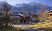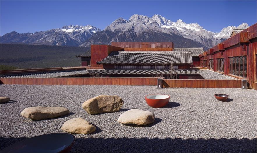 設(shè)計借鑒納西建筑風(fēng)格,首層以磚石為主,二層以上為木構(gòu)形制,屋頂為傳統(tǒng)的中國古典形制的大屋檐,外飾材料均選取當(dāng)?shù)禺a(chǎn)的銹石、青石,松木。3,000多米海拔的景區(qū)氣候干燥、風(fēng)力強(qiáng)度大,自然環(huán)境條件無論對設(shè)計還是施工來說都是非常大的挑戰(zhàn),設(shè)計團(tuán)隊對于建筑的挑檐、屋面瓦、屋檐木結(jié)構(gòu)、鋼結(jié)構(gòu)設(shè)計都做了特殊的設(shè)計處理。從裸露在外的橡木房梁與飛檐翹角,到色彩斑斕的民族織錦與露天篝火,雪山酒店的建筑群營造了強(qiáng)烈、獨(dú)特的場所感,是現(xiàn)代與傳統(tǒng)、人造與自然的完美結(jié)合。