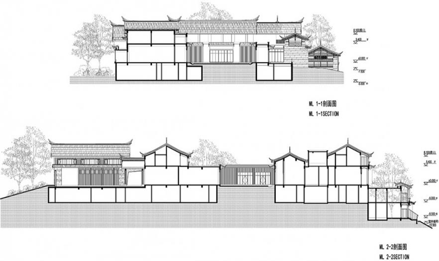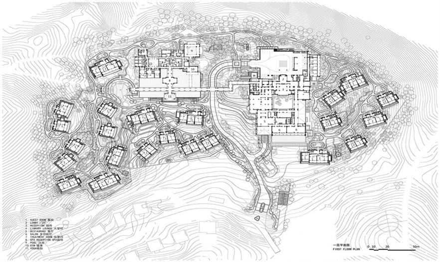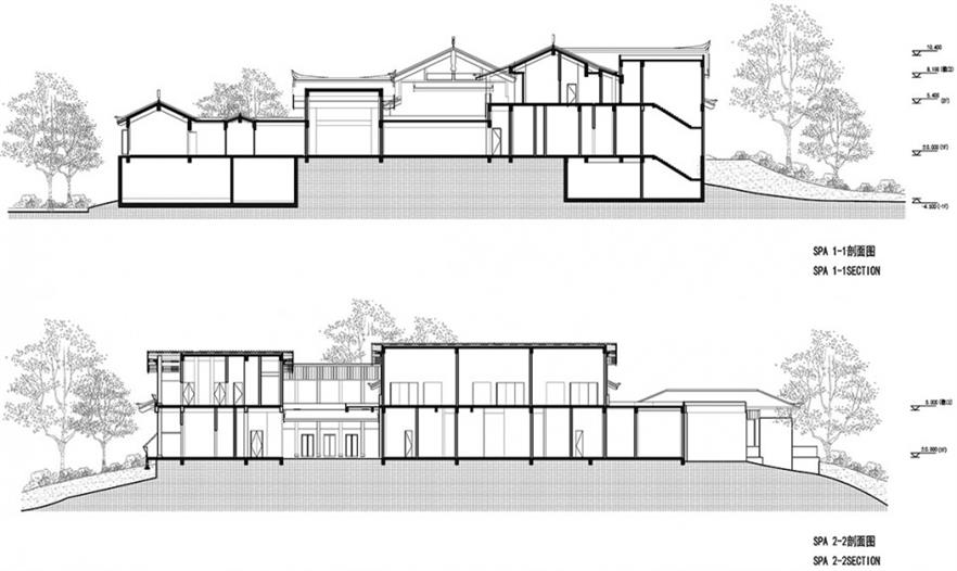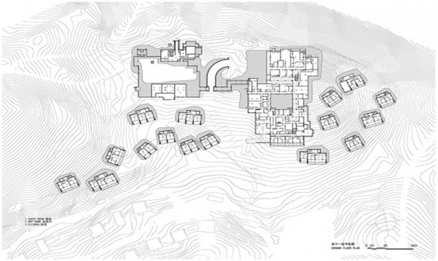 酒店功能分為公共區(qū)、SPA區(qū)和客房區(qū): 公共區(qū)涵蓋了所有的主要公共服務(wù)功能,建筑首層提供接待停車、入住登記、酒席宴會、露天餐飲、觀景平臺、主題酒廊等服務(wù),多功能廳圍繞內(nèi)庭院設(shè)置。二層局部設(shè)置客房套間,通過連廊相接,位于宴會廳之上的雪山套房為整個園區(qū)視野最佳處,總覽全景。