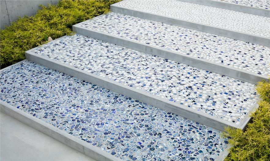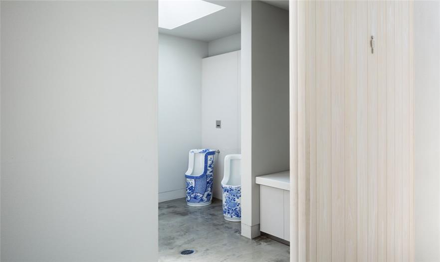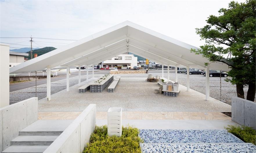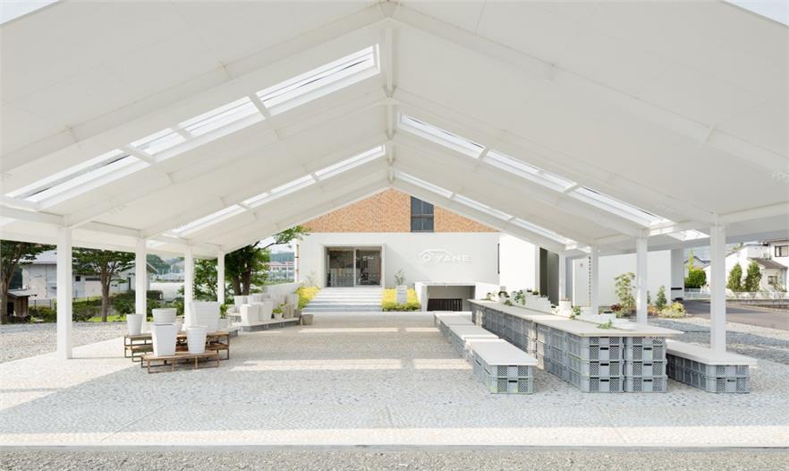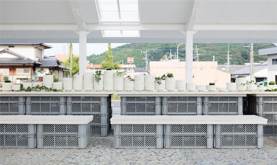 整個(gè)項(xiàng)目中都運(yùn)用了瓷制品的殘片。在柜臺和墻壁附近可以看到一個(gè)名為“母子”的白色系列陶瓷,在原來是用于燒造瓷器的。建筑中的燈和標(biāo)志也是使用陶瓷制作的。主體結(jié)構(gòu)的屋頂是模仿這個(gè)地區(qū)典型的瓷器制作工廠設(shè)計(jì)的。外部空間的地面也將瓷器碎片與水泥混合作為鋪裝。