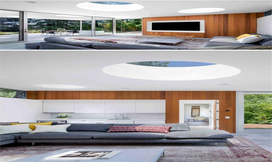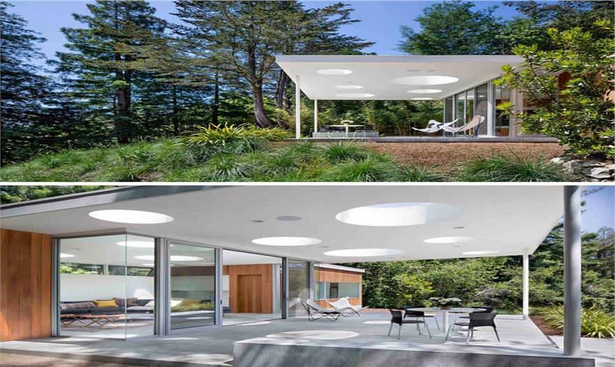 一旦到達(dá)這個(gè)客房,看到的就是一個(gè)有遮蓬的戶外門廊??头科教沟奈蓓斢胁煌叽绲膱A形天窗,當(dāng)從主屋向上看會(huì)呈現(xiàn)出有趣的圖案。