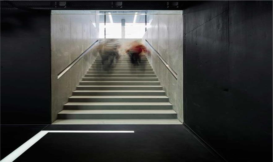 由于整個(gè)地下是黑暗的,通往展覽區(qū)的樓梯就像2個(gè)世界之間的分界。這個(gè)理念在完成期間出現(xiàn)的,因?yàn)樵撌聞?wù)所得知它們不會設(shè)計(jì)展覽空間。該事務(wù)所害怕過多布景重現(xiàn)歷史,所以想要通過這一步進(jìn)行斷絕。