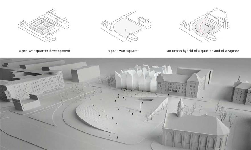 該建筑將2個(gè)矛盾的傳統(tǒng)結(jié)合在一起——戰(zhàn)前的城市區(qū)和戰(zhàn)后的城市區(qū)。這就是城市混合功能的建造方式——將該空間圍合成一個(gè)區(qū),同時(shí)保持一個(gè)開放公共空間的價(jià)值。該事務(wù)所要以此為愛樂廳和教堂前面設(shè)置一些前景,這樣就能原有廣場的基礎(chǔ)上進(jìn)行設(shè)計(jì)。之前城市區(qū)域的標(biāo)志是微微起伏的對角。其中一個(gè)包括一個(gè)博物館,另一個(gè)是一個(gè)小山,將廣場與繁忙的街道隔離開。因此在廣場還建造了一個(gè)圓形露天空間。為了展現(xiàn)整個(gè)設(shè)計(jì)的連貫性,該事務(wù)所采用了混凝土這種材料,廣場的地面高度也有所不同。