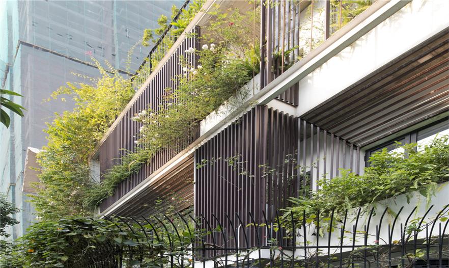 這座大小適中的住宅位于一個(gè)各方面都很便利的場(chǎng)地上,—— 一個(gè)交界處,并且還擁有很好的視野角度。然而,房子朝向西面讓人很煩惱,因?yàn)槲鲿竦年?yáng)光太多,這也是它的缺點(diǎn)之一。因此,我們用一個(gè)平行的鋼框架蓋住了整個(gè)房子,同時(shí)也讓綠色的藤本植物遍布建筑的正面。