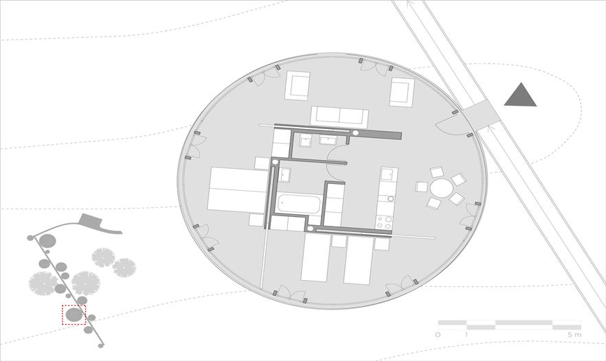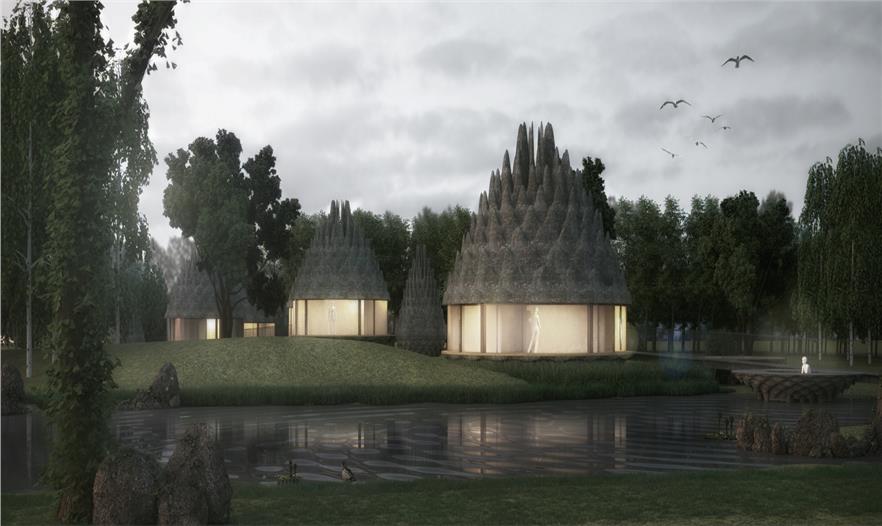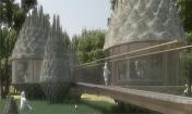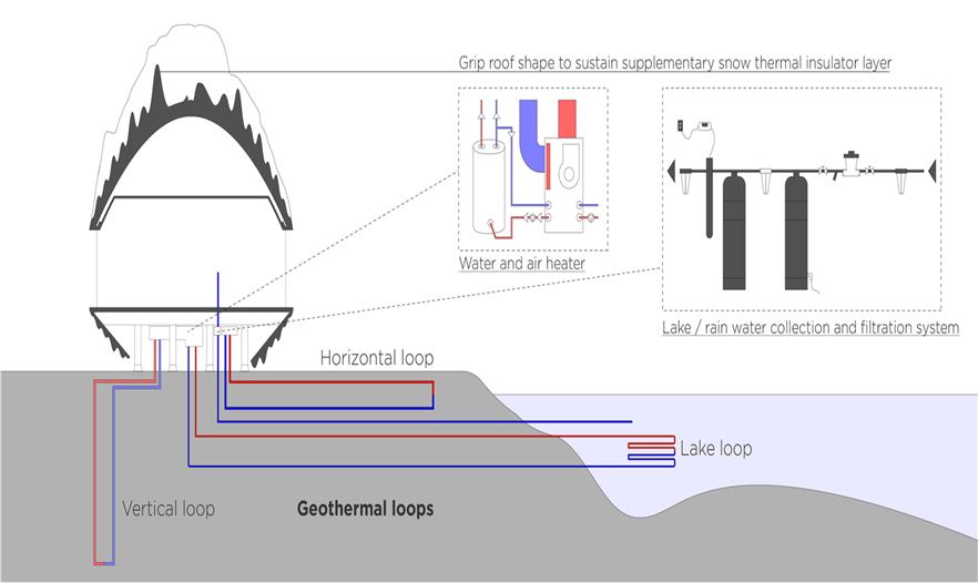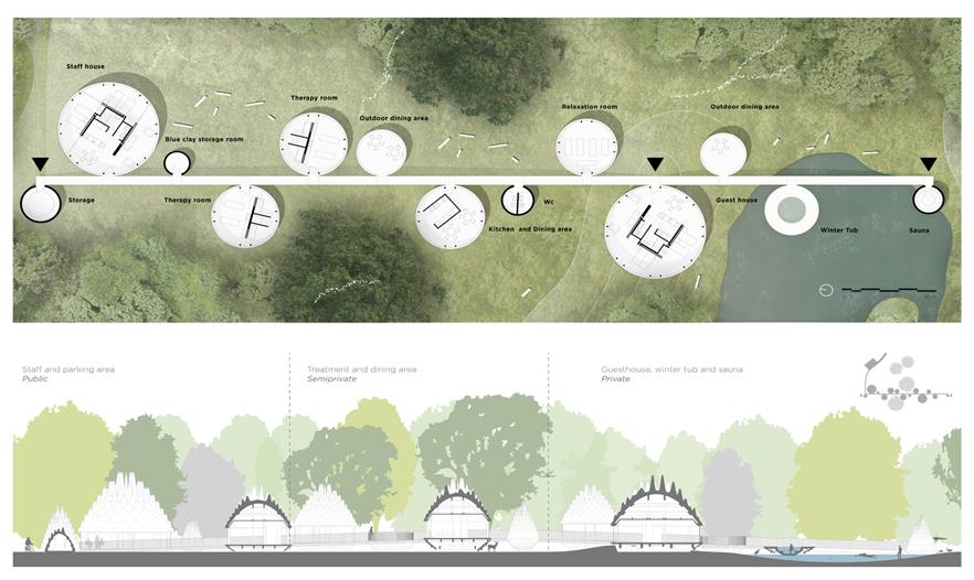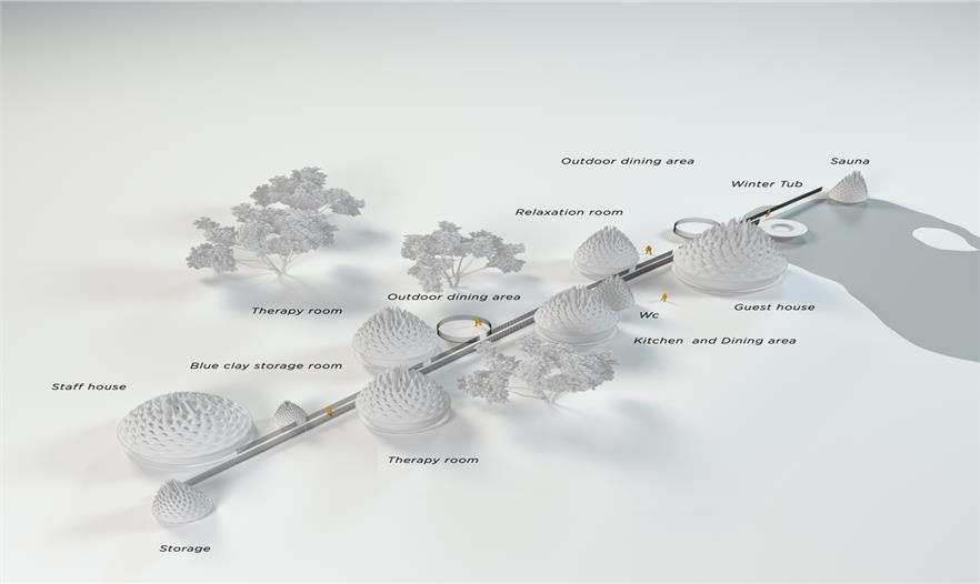 水療中心本身高架于地面,分散在整個場地里,中間有木制人行橋相連。冬天的浴盆、桑拿、理療室和用餐區(qū)將置于松果結(jié)構(gòu)內(nèi)。其他的綠色措施還有水過濾系統(tǒng),地?zé)嵫h(huán)和太陽能窗科技。這些措施都將有助于將度假村對環(huán)境造成的影響保持在較小的范圍內(nèi)。