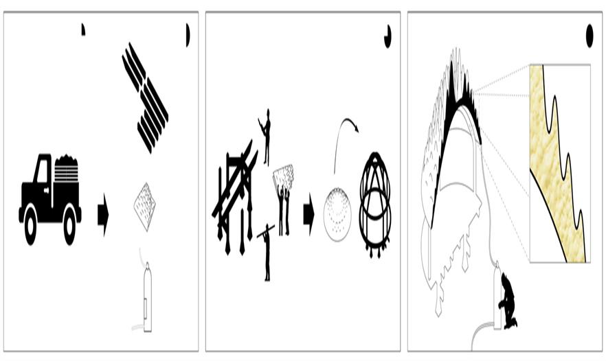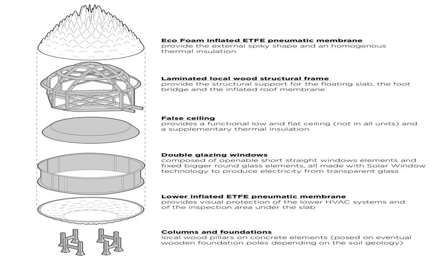 由當(dāng)?shù)啬静慕ㄔ斓膶訅狠p質(zhì)框架將成為充氣屋頂膜結(jié)構(gòu)的支持結(jié)構(gòu),使其能夠承受積雪等負(fù)載。在冬季,通過在“松塔”收束的尖端內(nèi)收集積雪,泡沫的厚度和均勻性將得到增強,單元將變得更加隔熱。