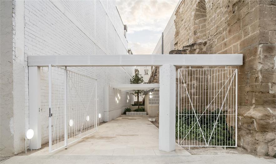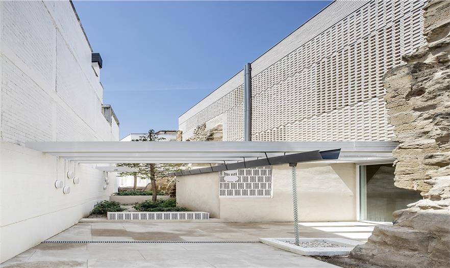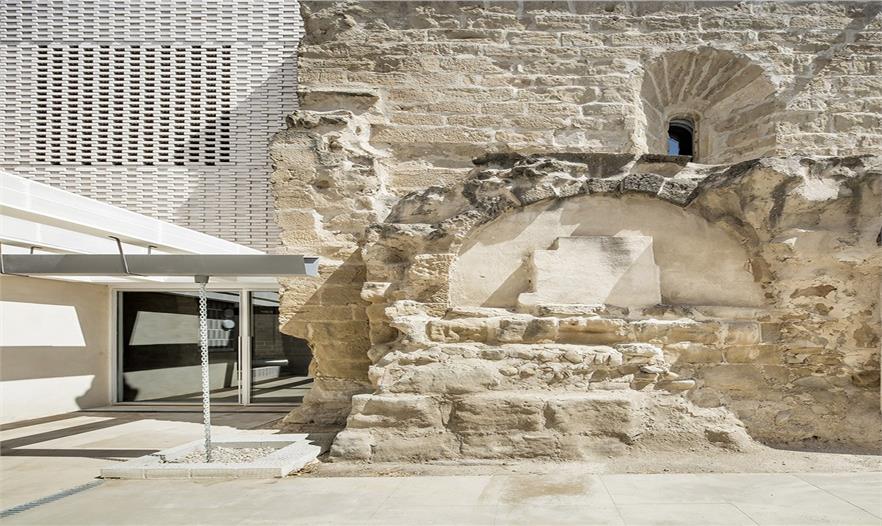 項目的主要工作是對建筑立面和房頂?shù)男迯?。新的修復方案將立面改造成網(wǎng)格狀磚墻和阿拉伯式瓦片屋頂。整個項目構(gòu)思被看做是一個新的建筑陶瓷外殼輕輕支撐在古建筑墻壁的遺跡上。
