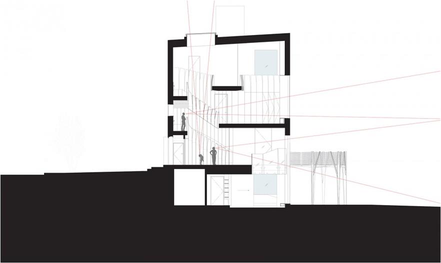 兩個垂直空間的介入成為這個建筑最特別的地方。第一個空間從上至下連接入口處和底層花園,并延伸到新的客廳和南部景觀中。第二個垂直空間將入口連接到被天窗蓋住的游樂場,這一部分原本是建筑的閣樓空間。經(jīng)過兩個垂直空間的干預(yù),臥室,工作和儲藏領(lǐng)域完美的連接在一起。