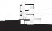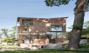 周邊磚結(jié)構(gòu)墻作為從北邊正式和封閉的空間到南邊開放空間的過渡。與此對應(yīng)的,立面東西走向的薄層壓板組成連接南北走向的空間。房中幾乎所有的元素:臺階,衣柜,窗戶框架都包括這些紋理。從北面堅實立面到南面的透明玻璃立面,房子的構(gòu)造加固了這個改變。