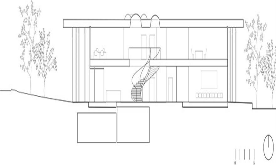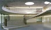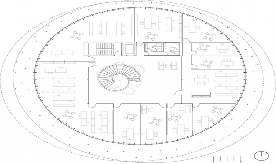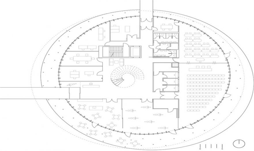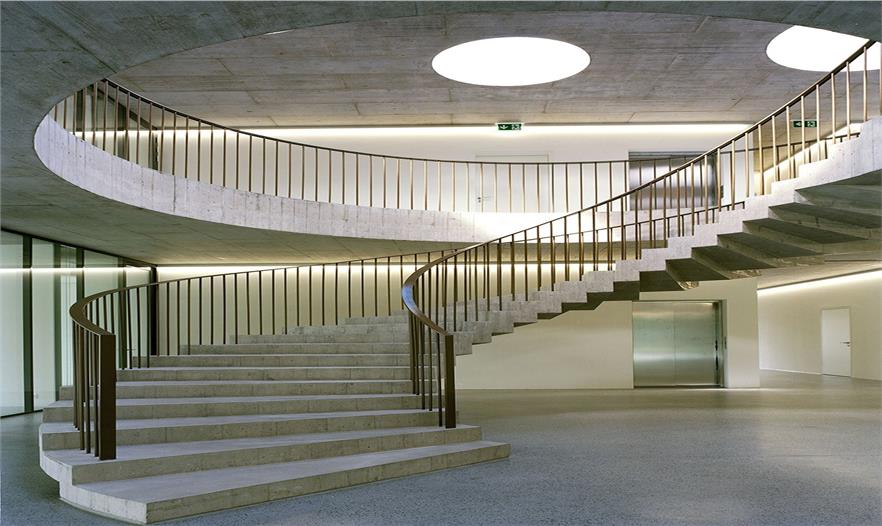 在建筑的中部設有一座造型獨特的旋轉(zhuǎn)樓梯,自然光通過上部的圓頂天窗照亮了這個空間。樓梯的弧度延續(xù)了入口大廳的形態(tài)趨勢,將人們自然地帶到二層的管理設施之中。該樓梯為一個獨立的單元,由混凝土澆灌而成,其下部呈三角形,如同脊椎結(jié)構(gòu)一般支撐建筑的透明表皮,并與其融合成一個整體。