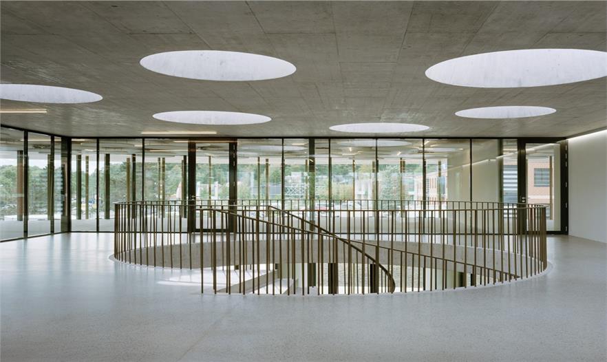 建筑的技術(shù)設施最大化保證了其使用的靈活性。外圍的辦公區(qū)中設有熱敏板系統(tǒng),可以通過天花調(diào)整室內(nèi)溫度,抬起的地板下設置了通風系統(tǒng)和電網(wǎng)。大廳以及通道區(qū)域除了一層的地暖設施外沒有設置任何技術(shù)裝置,空間簡潔開闊。一層外側(cè)的遮陽系統(tǒng)和二層上方伸出的屋面根據(jù)當?shù)靥栠\行的軌跡設計,有效控制了由于光照造成的季節(jié)性過熱,創(chuàng)造了舒適的使用環(huán)境。