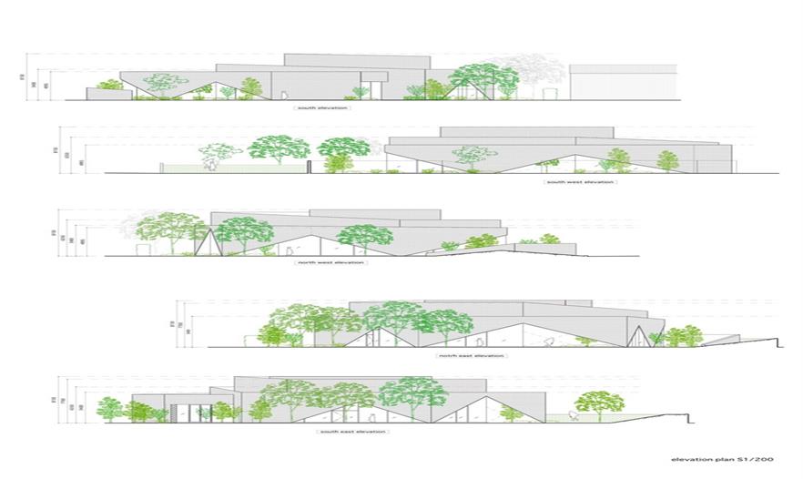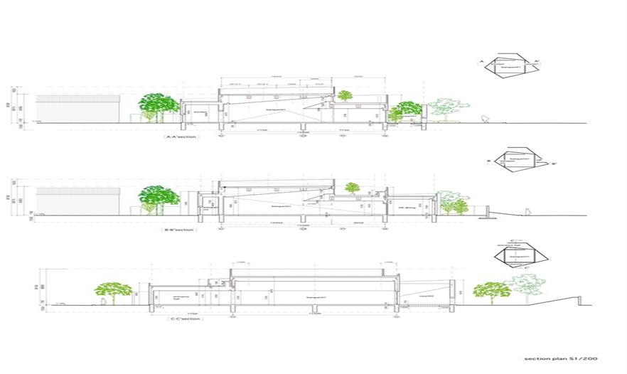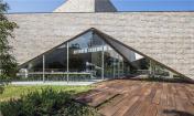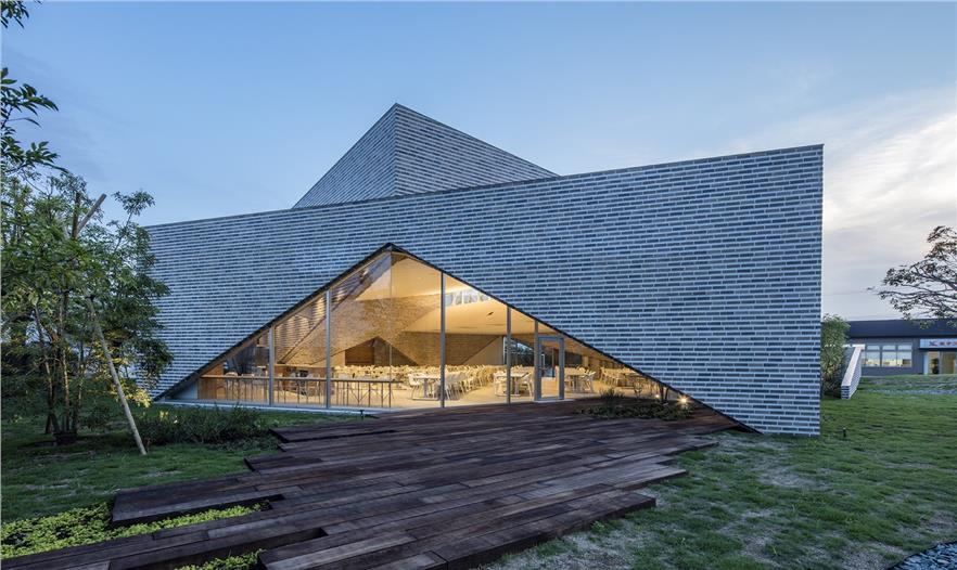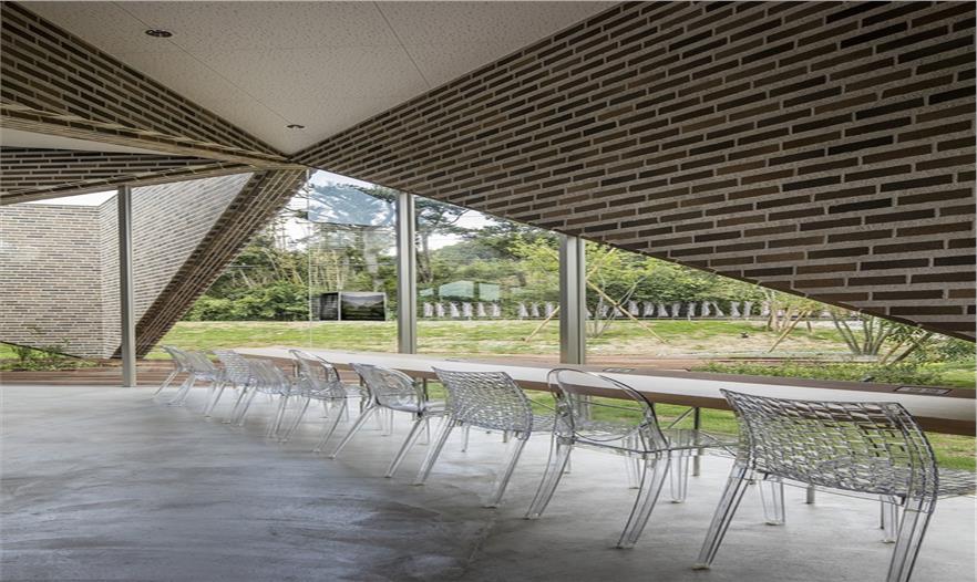 這個(gè)有著15m x 15m大小的主要宴會(huì)廳,在午餐時(shí)間可容納多達(dá)250人的450㎡單層建筑,僅用一堵墻,連接了所有的空間:一個(gè)風(fēng)格截然不同的私人房間,廚房,貴賓室和兩個(gè)庭院。通過(guò)設(shè)計(jì)墻面開(kāi)口,我們想創(chuàng)造出每個(gè)空間都互相關(guān)聯(lián)的感覺(jué)。我們想要大的開(kāi)口,連通每一個(gè)空間,但又不破壞“一整面墻”的設(shè)計(jì)。為了實(shí)現(xiàn)這一點(diǎn),我們決定使用三角形開(kāi)口。開(kāi)在外墻上,三角形的尖角朝上。這些開(kāi)口沿著宴會(huì)廳的對(duì)角線,非常顯眼,指明走向外部空間的方向。結(jié)構(gòu)方面,我們用大的桁架做每個(gè)開(kāi)口,為建筑做一面長(zhǎng)墻,是非常有特色的建筑設(shè)計(jì)。