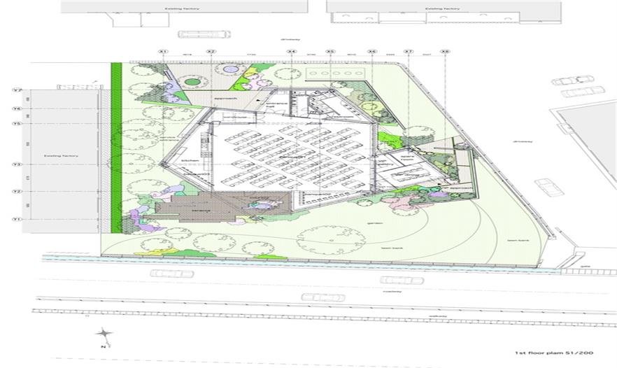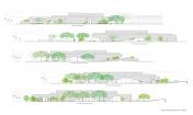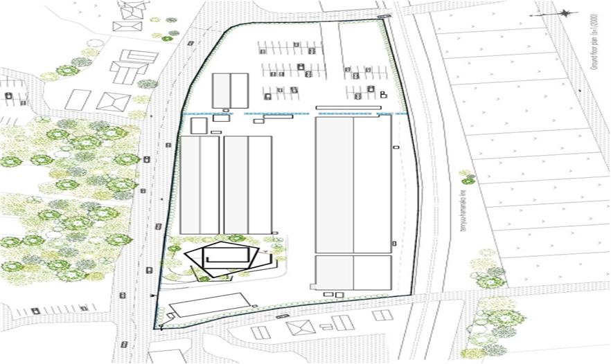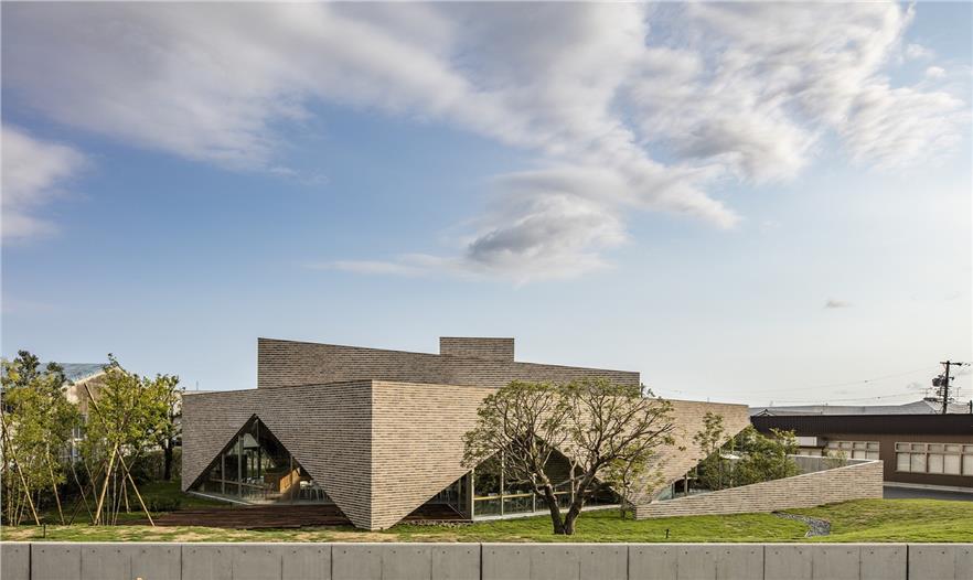基地是工廠建筑區(qū)的一片空地,幸運(yùn)的是,場(chǎng)地里有高大的樹(shù)木生長(zhǎng),我們也可以利用區(qū)域外的山地。為了充分利用這片區(qū)域已有的自然環(huán)境,在我們開(kāi)始設(shè)計(jì)必需的功能設(shè)備,水電設(shè)備和裝置時(shí),我們決定創(chuàng)造一堵長(zhǎng)且連續(xù)的墻。這堵墻從外面開(kāi)始延伸,然后包含了室外花園(soto),之后穿進(jìn)了房間和其他內(nèi)部功能設(shè)施,最后在進(jìn)入內(nèi)部(Uchi)后停止。這一堵延綿不斷的墻比喻了,公司的許多員工在朝著他們的目標(biāo)勇往直前,未來(lái)的公司,一切事與人都參與其中并成為“一個(gè)團(tuán)隊(duì)”。