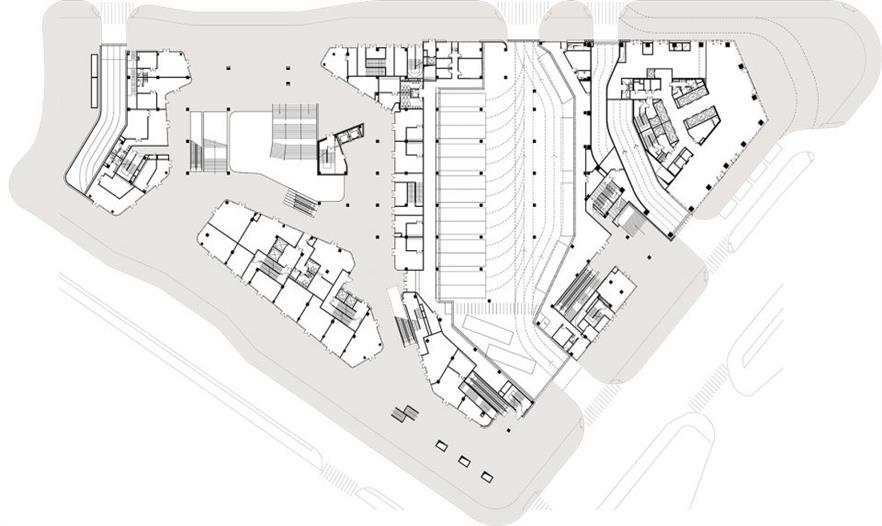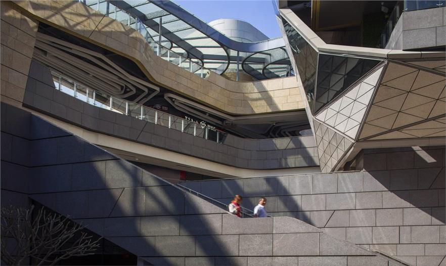 四層的商亭包外立面由水平條帶狀石材組成,這來自于周圍山體巖層的啟發(fā)。這些元素為項(xiàng)目生成一種更加親人的尺度,同時(shí)又能更好地將商業(yè)及廣告標(biāo)示與建筑有機(jī)延續(xù)。商亭的角落彎 曲,柔化了建筑并引導(dǎo)人流。所有的商亭都在首層陳列延續(xù)的玻璃透明店鋪,而獲取最大限度 的商業(yè)機(jī)遇。