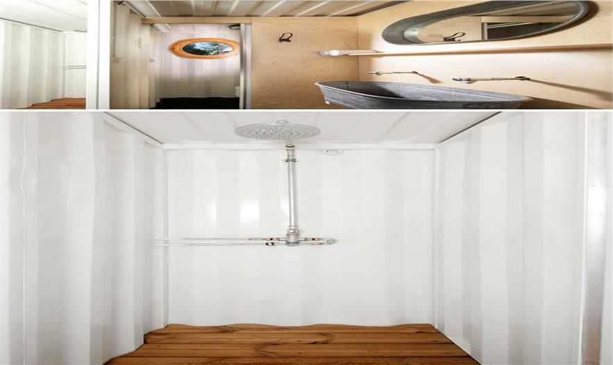這些集裝箱只放在鐵路枕木上。每個(gè)集裝箱功能各自不同,只與當(dāng)?shù)仉娏υ聪噙B。這個(gè)帶有洗浴設(shè)施的集裝箱有一個(gè)內(nèi)置的水箱,供應(yīng)淋浴和水池,還配備有節(jié)水龍頭。