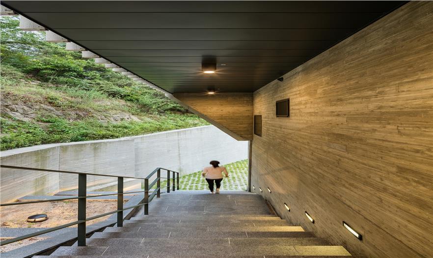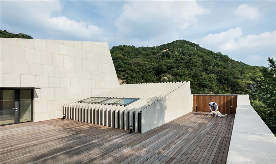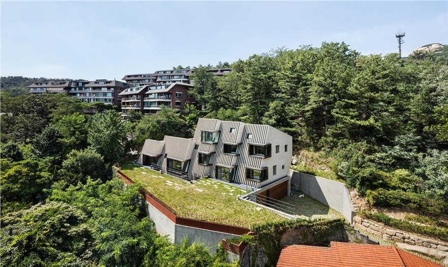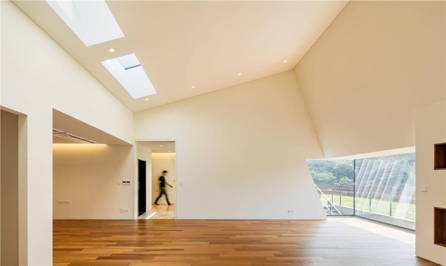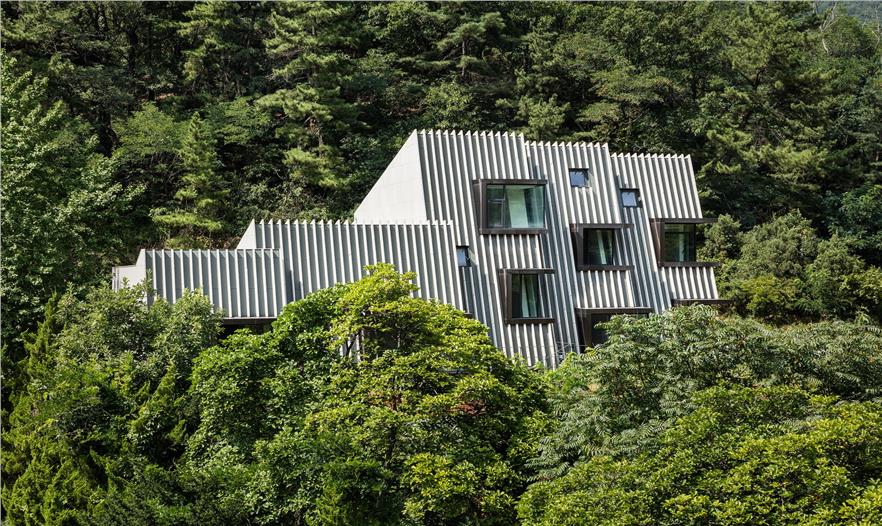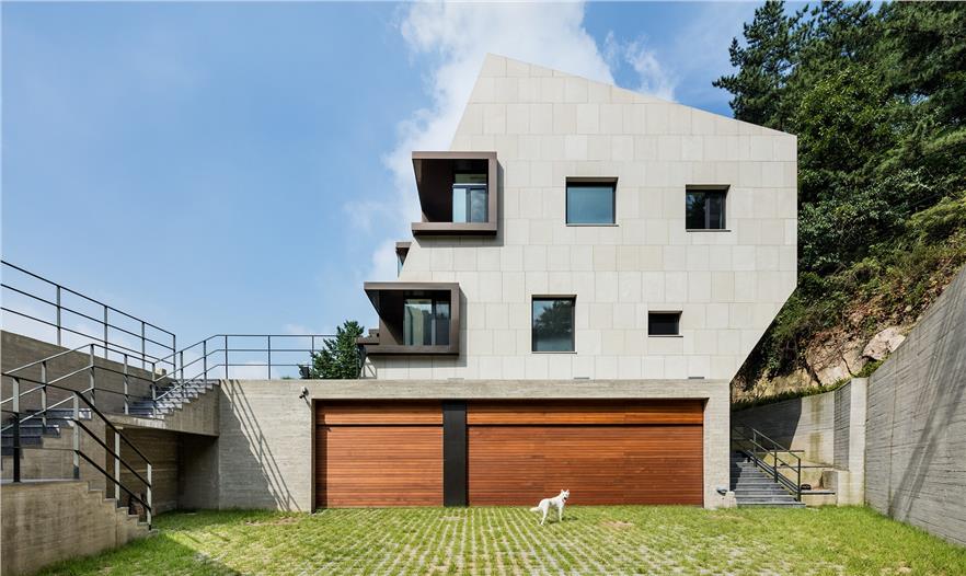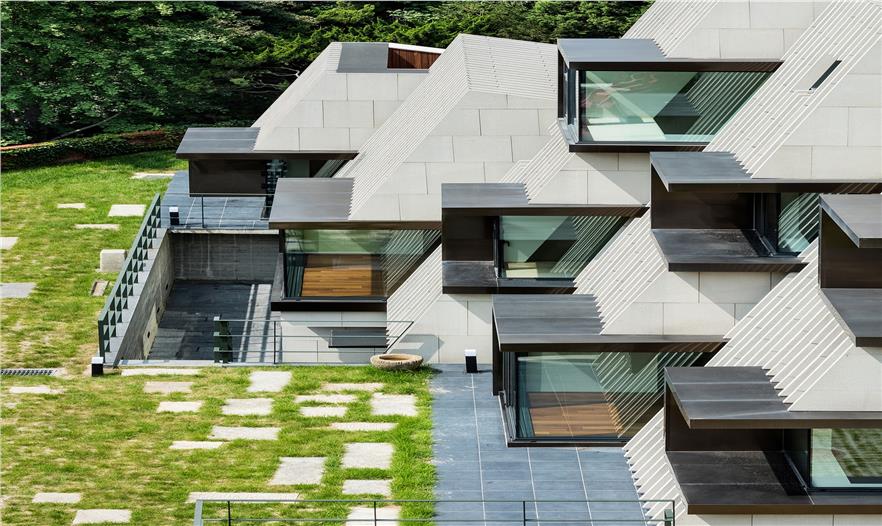 最近完工的Deep House住宅是建筑師Homin Kim 6年追求和決心的結(jié)果。Kim想要在頗具挑戰(zhàn)性的景觀中設(shè)計一個現(xiàn)代化、實用性住宅,得到了客戶堅定不移的支持和信任。Deep House最令人震驚的是其屋頂,朝向某個角度傾斜設(shè)計,好像與墻壁融為一體。Deep House住宅撇去了傳統(tǒng)的屋頂設(shè)計理念,采用室外石制百葉窗的理念,讓住宅體量分散到淺層深度上。傾斜的屋頂下面是中空空間,而設(shè)計的垂直墻壁不僅用作隔離層,提高能源有效性,還能增加額外的儲存空間。