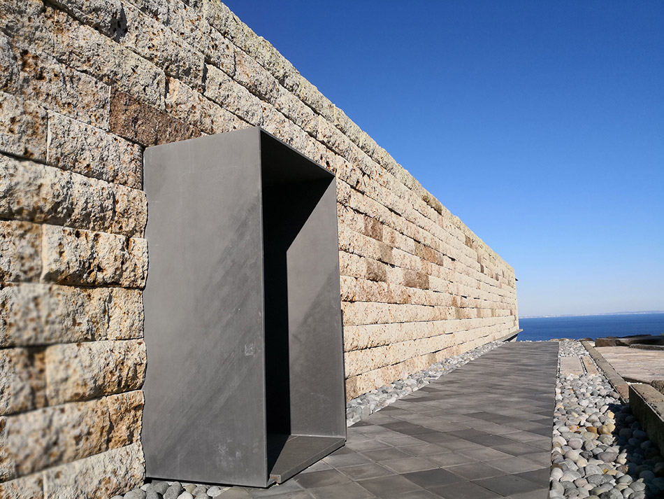 平行于隧道,鋪設(shè)光學(xué)玻璃的舞臺(tái)位于扁柏框架之下。在冬至的早晨,一旦平臺(tái)邊緣能夠捕捉到微弱的陽(yáng)光,它就能散發(fā)出耀眼的光芒。在直接與舞臺(tái)相鄰的地方,我們重建了一個(gè)完整的羅馬禮堂。當(dāng)我們坐在圓形劇場(chǎng)里,花上一點(diǎn)時(shí)間來(lái)沉思時(shí),玻璃舞臺(tái)似乎完全漂浮在海面上。