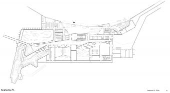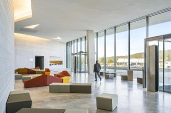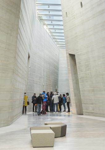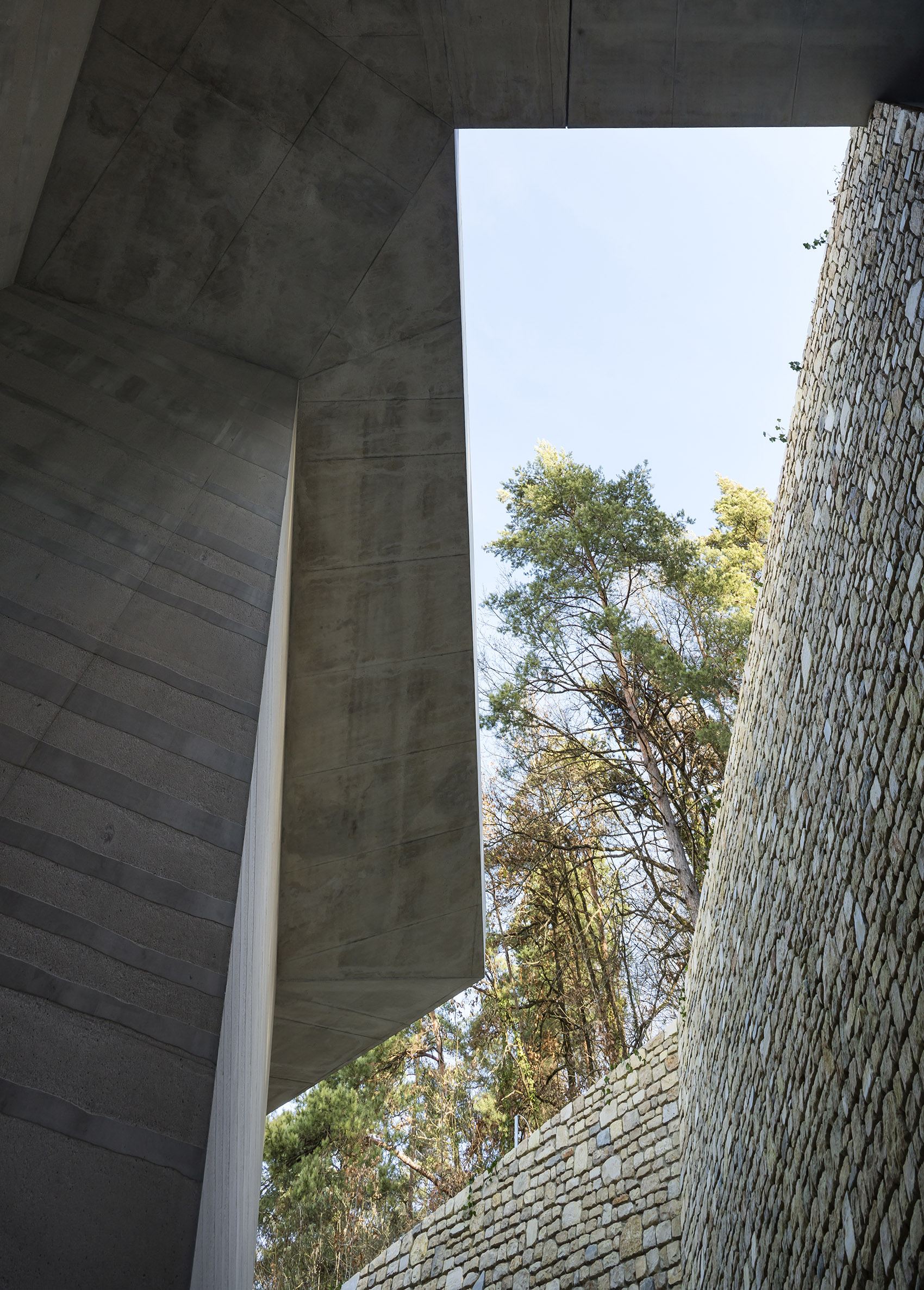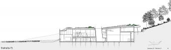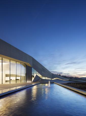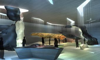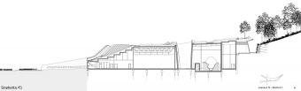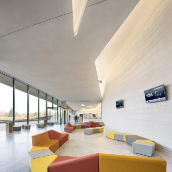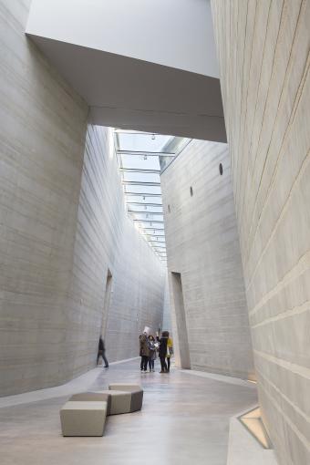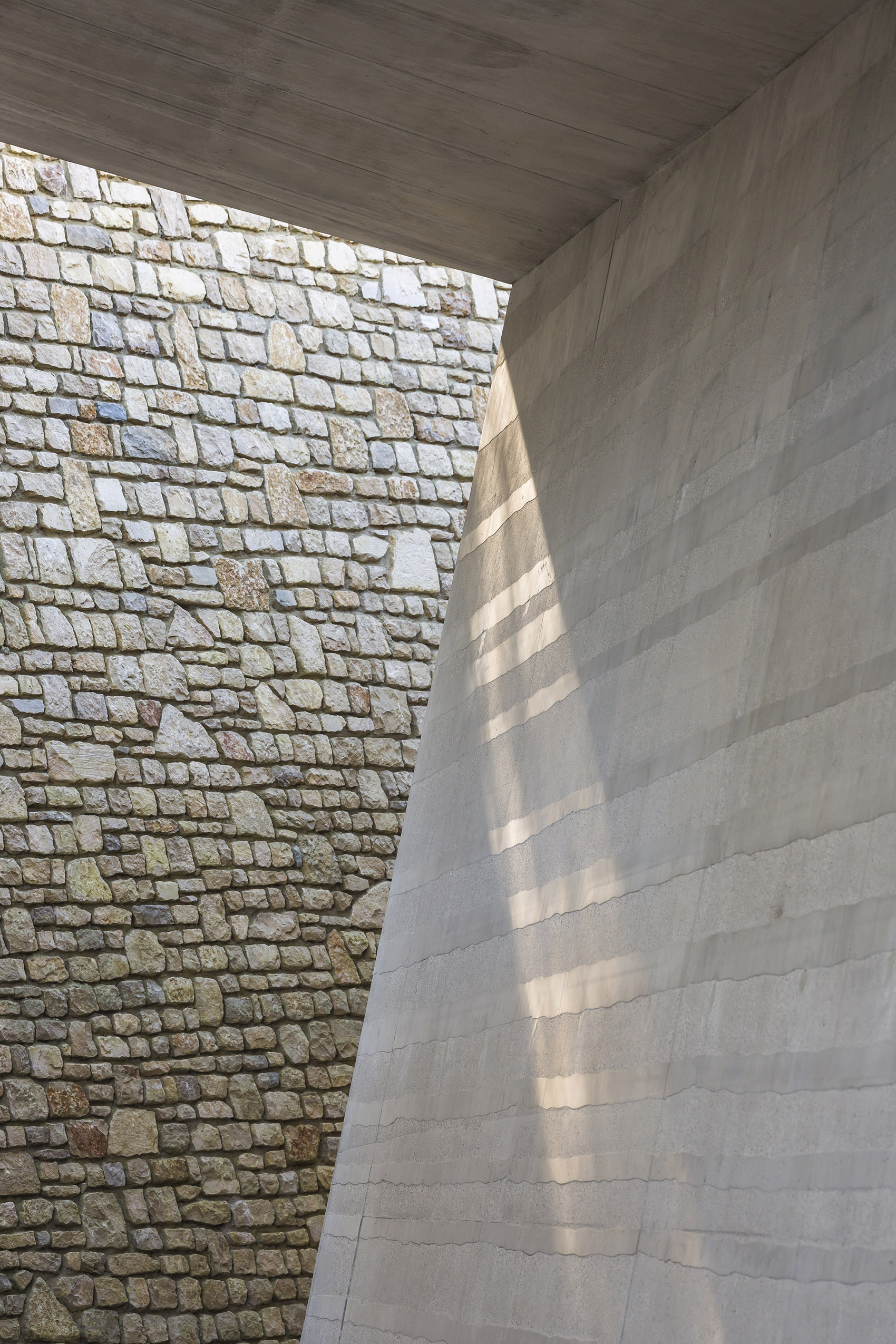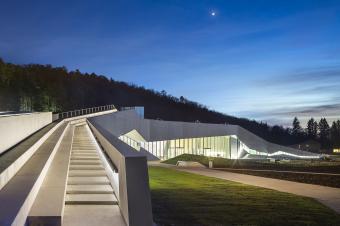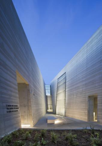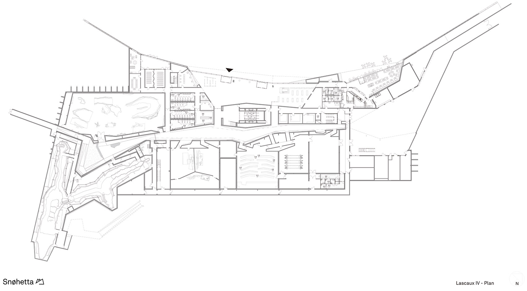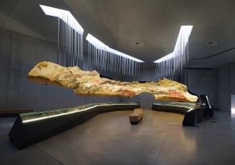 作為 Vézère 山谷風景中的的現代藝術場館,Lascaux IV 博物館展現了史前藝術作品的新體驗,并提供了深入了解場地豐富遺產的新途徑。現代的幾何形態(tài)和物質性也暗示出仿真科技的存在:使訪客意識到他們是在欣賞復制品的同時而不會分散其注意力。建筑外觀反映了石灰?guī)r地質學的形態(tài),并展示了一個戲劇性的展覽體驗,旨在將游客帶入到一個洞穴綜合體,其中包括隧道,被片段式光源照亮的室內,以及由最先進技術和場景技術所介導的繪畫。