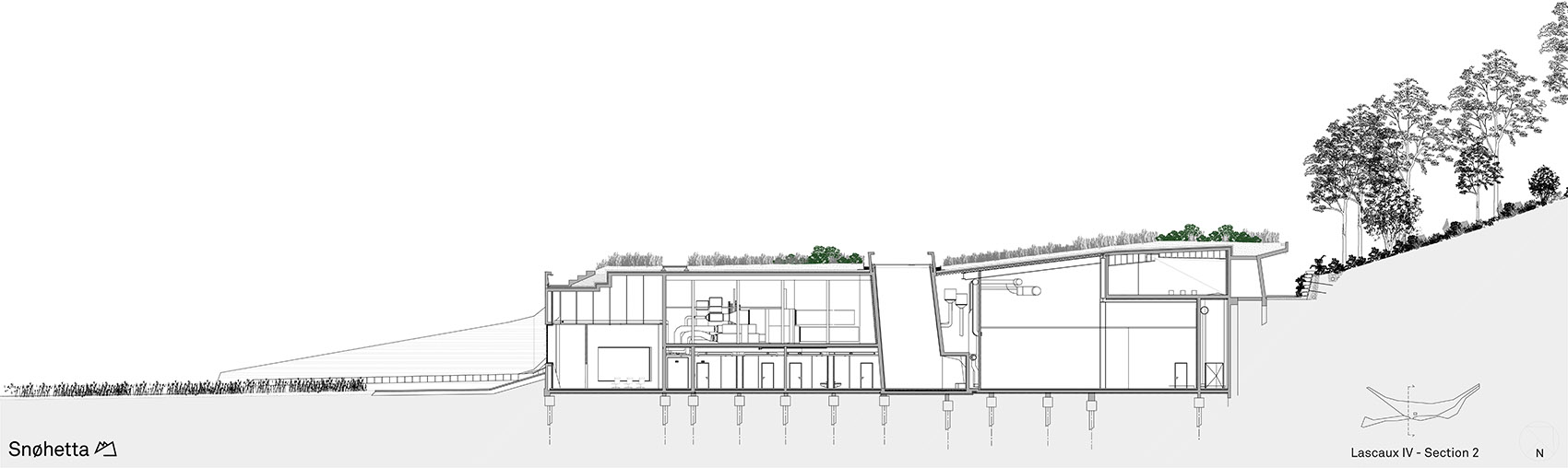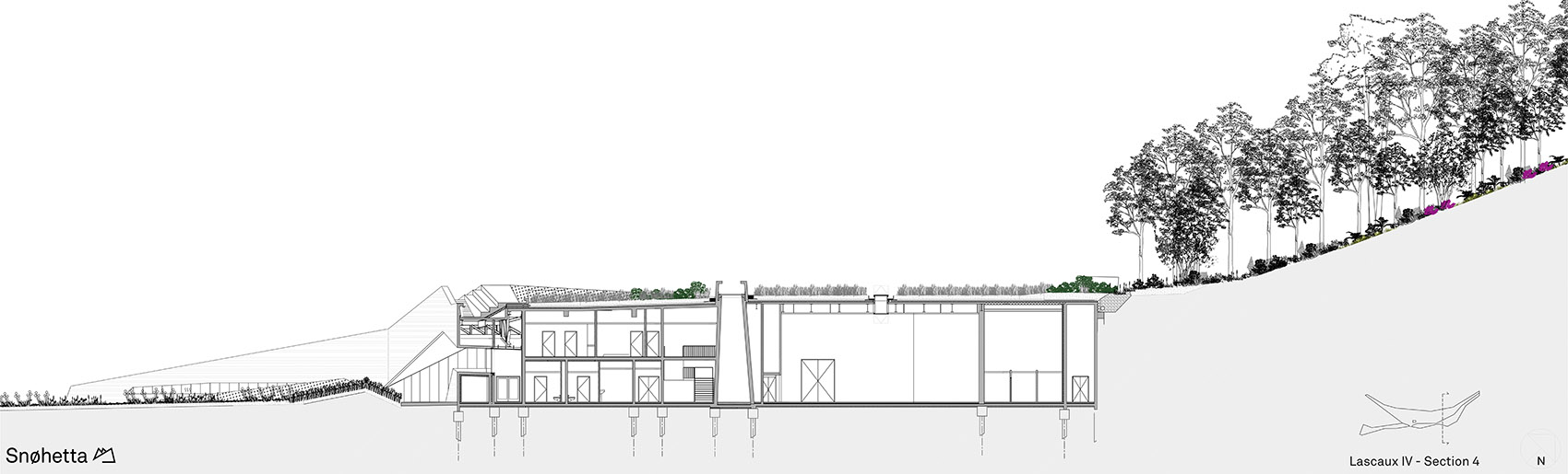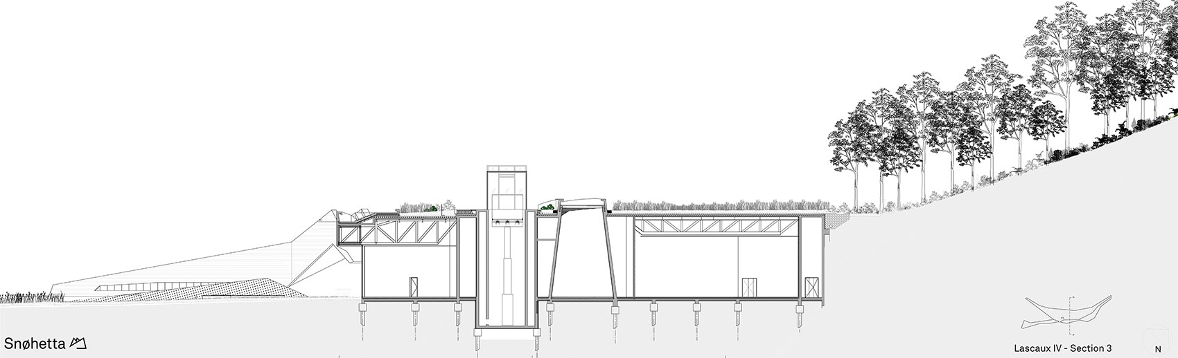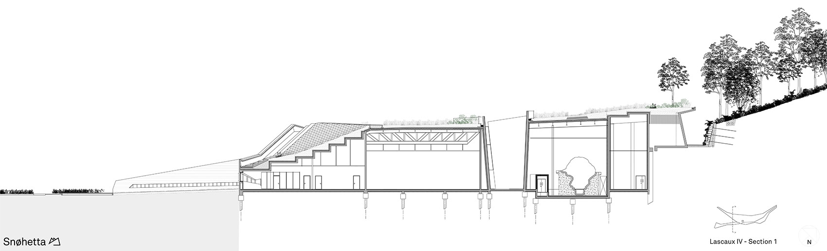 游客體驗經過了精心的設計。從大堂開始,乘坐電梯到屋頂的眺望臺,在那里可以欣賞到 Montignac 和 Vézère 山谷的壯麗全景。然后,他們通過一個平緩的斜坡向下進入巖洞一般的空間。這個屋頂沿著森林的邊緣傾斜,通過緩坡直達復制品的入口。通過景觀的變化和逐漸下降的蜿蜒路徑,讓游客感受到了時空的變化,創(chuàng)造類似于1940年洞穴發(fā)現者的體驗。