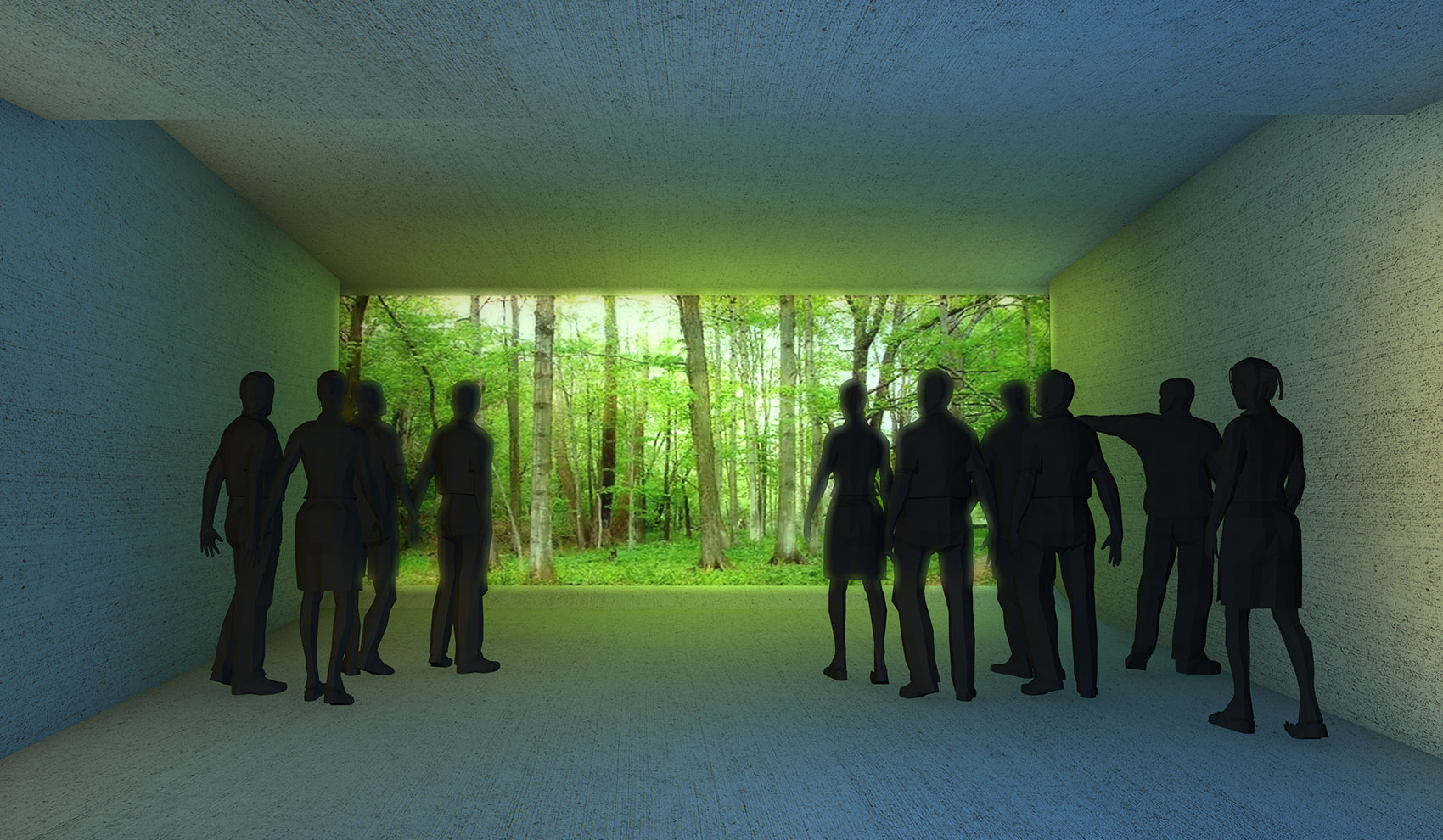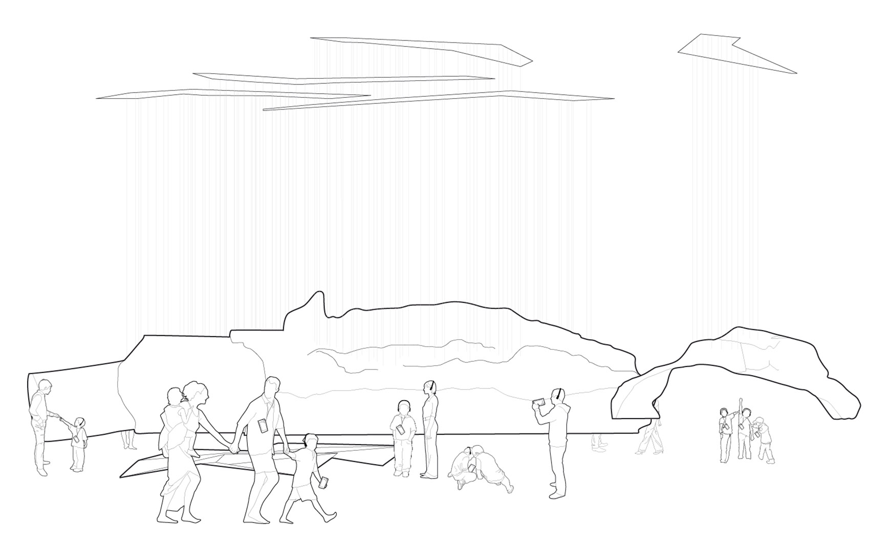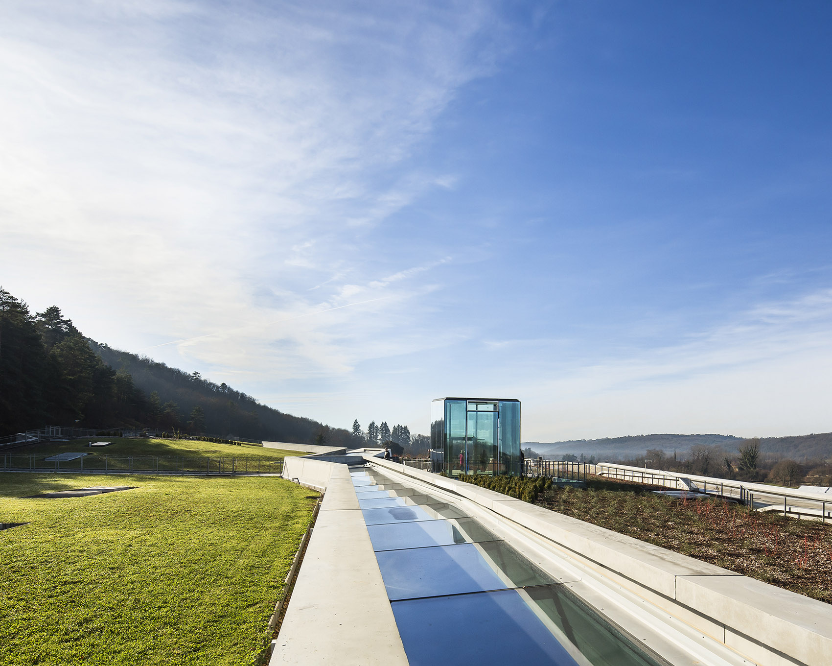 游客體驗經過了精心的設計。從大堂開始,乘坐電梯到屋頂的眺望臺,在那里可以欣賞到 Montignac 和 Vézère 山谷的壯麗全景。然后,他們通過一個平緩的斜坡向下進入巖洞一般的空間。這個屋頂沿著森林的邊緣傾斜,通過緩坡直達復制品的入口。通過景觀的變化和逐漸下降的蜿蜒路徑,讓游客感受到了時空的變化,創(chuàng)造類似于1940年洞穴發(fā)現者的體驗。