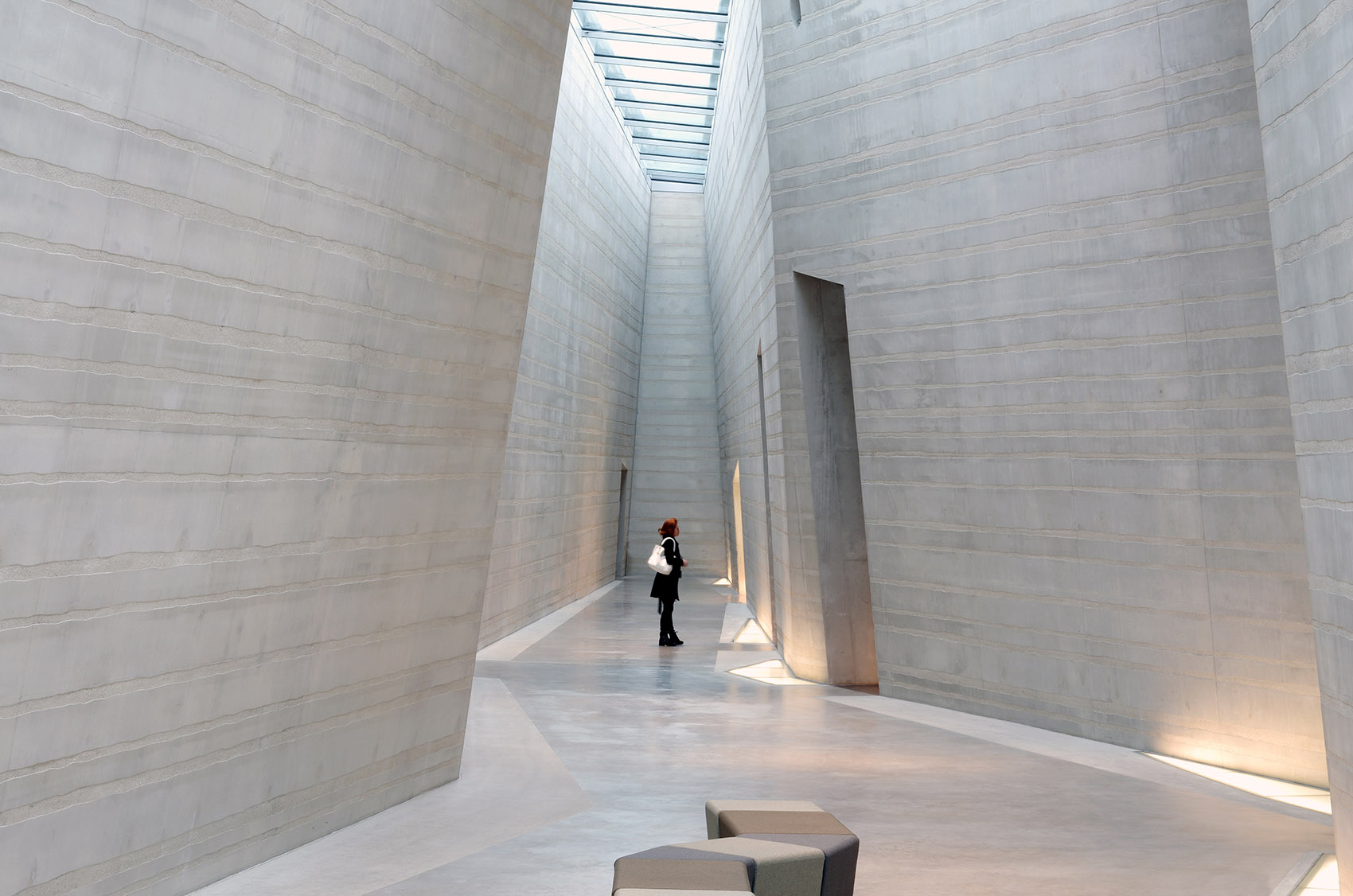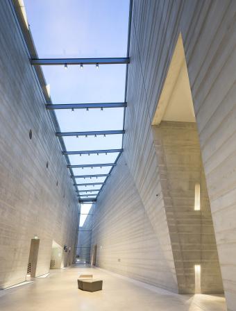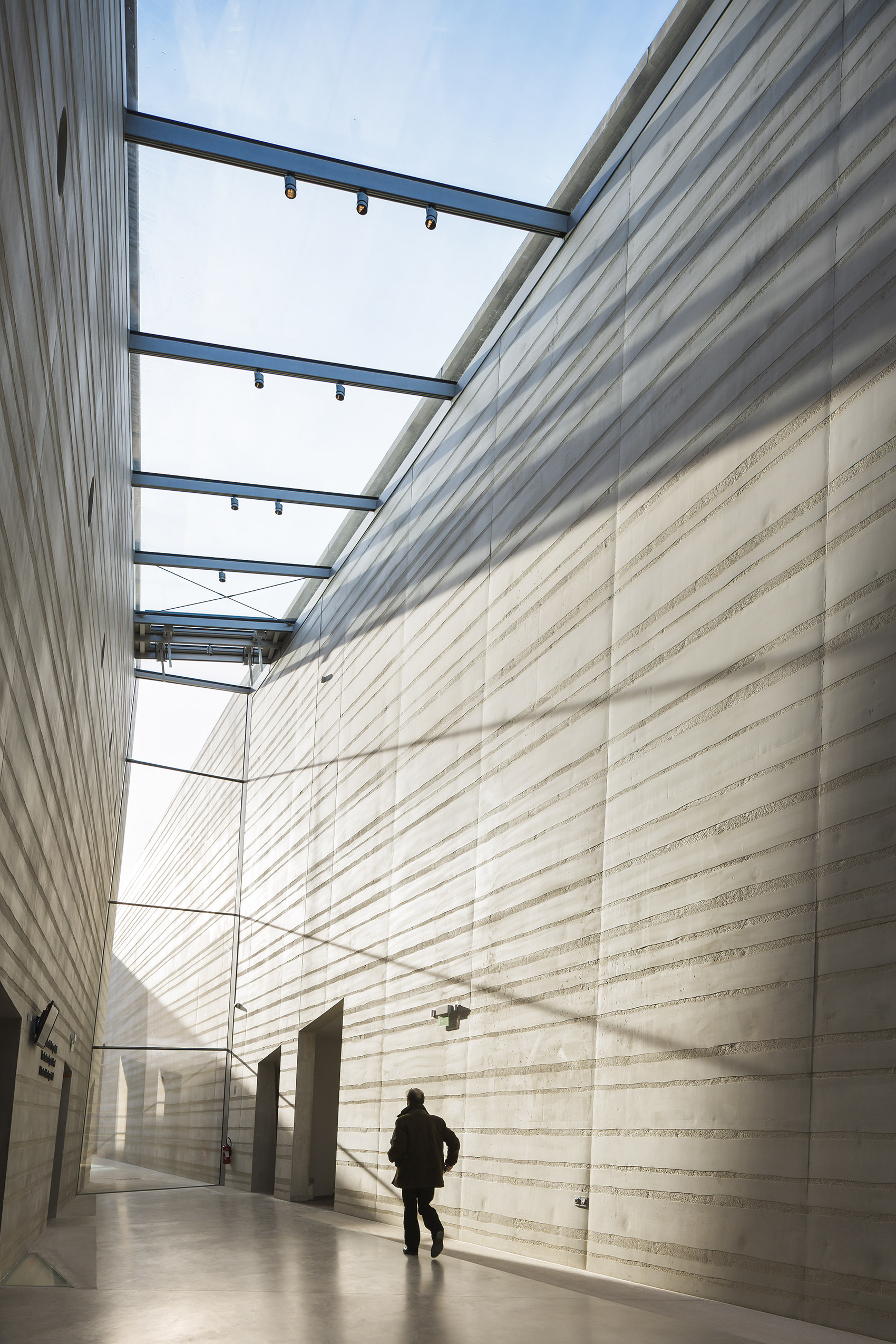 建筑空間被兩個主要自然光源塑造。一個是通過橫向切割創(chuàng)造的,臺生兩個平面,并將它們分開,產生垂直的立面,使得光線可以進入建筑物。另一個是沿著建筑物的軸線的總想的切割,這揭示了天窗的水平玻璃表面,并允許垂直的光線進入。在一天的過程中,游客可以體驗到通過屋頂玻璃和外墻進入的各種色調和光線。