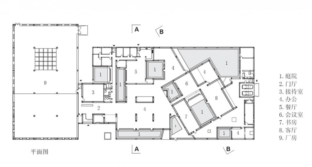 建筑外墻盡量封閉用以屏蔽外圍的喧囂,內(nèi)部則依據(jù)功能要求設(shè)置了一系列不同大小變化的院子,并結(jié)合不同景觀(guān)賦予每一個(gè)院子不同的空間性格。這些院落空間不僅僅能解決建筑的采光通風(fēng)問(wèn)題,也為辦公人員提供了一個(gè)個(gè)安靜而富有意境的內(nèi)部景觀(guān)環(huán)境。
