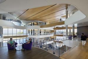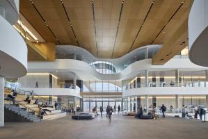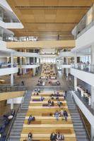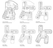 這個(gè)大型5層的 LEED 級(jí)建使靈活性最優(yōu)化,以適應(yīng)不同規(guī)模的學(xué)習(xí)和合作空間,從2-20人,200-2000人。所有的活動(dòng)空間匯聚在中心的聯(lián)合廣場(chǎng)上,一個(gè)三層的中庭聚集了學(xué)生,教師員工和來(lái)訪者。教師中心是一個(gè)兩層的廣場(chǎng),集合了全球中心的智慧靈魂,為教師們提供了一個(gè)討論、辯論和尋找解決當(dāng)今緊迫問(wèn)題的解決方案的場(chǎng)所。