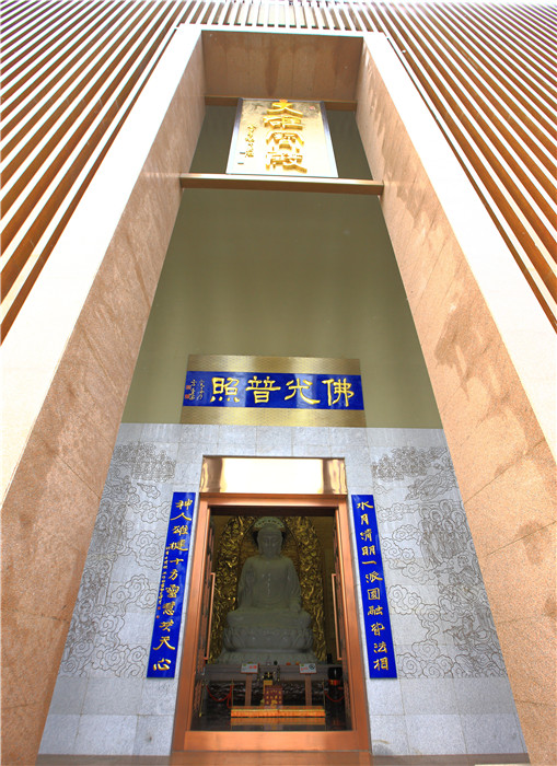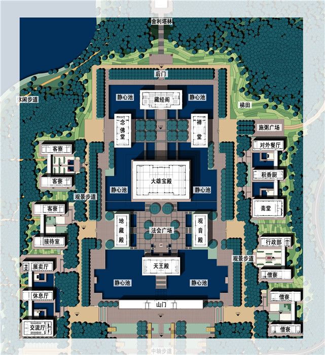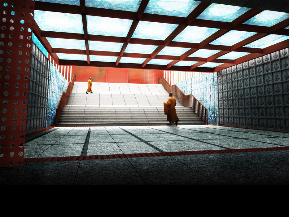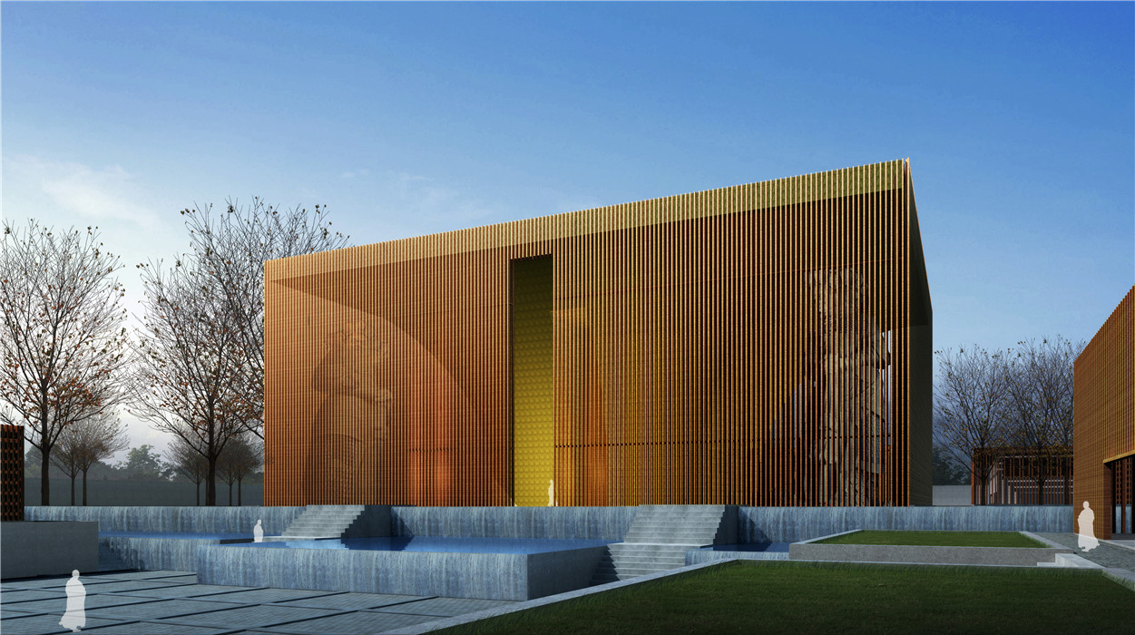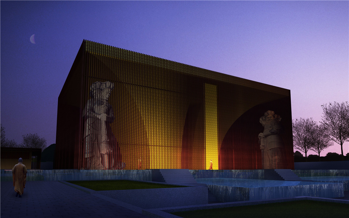 整個建筑群共分18個功能體:山門、天王殿、大雄寶殿、藏經(jīng)閣、地藏殿、觀音殿、念佛堂、禪堂、僧寮、客寮、行政部、接待部、齋堂、展賣廳、積香廚、休息廳、庫房、交流廳。建筑群總平面沿正南正北方向布置,縱向一根軸,橫向2根軸,縱軸上依次分布著山門、天王殿、大雄寶殿、藏經(jīng)閣。第一橫軸分別為觀音殿和地藏王殿,第二橫軸分別為念佛堂和禪堂。在四周還分布著僧尞、香積廚、客尞、展賣廳等建筑。各殿外立面采用仿木金屬格柵圍護,遠遠看過去,有種垂簾的感覺,尤其是到了晚上,燈光的映射使整個建筑有了一種“亦實亦虛,亦動亦滯、靈活通透”的效果。寺門延續(xù)了寺廟一貫采用的紅色平開木門,將現(xiàn)代與古典寺廟元素相結(jié)合,兩側(cè)的鐘樓及鼓樓采用了木格柵通透的處理手法,讓為世人祈福的鐘聲傳達的更遠,與佛教的啟迪心智、蕩污滌垢、祈福納祥巧妙結(jié)合。